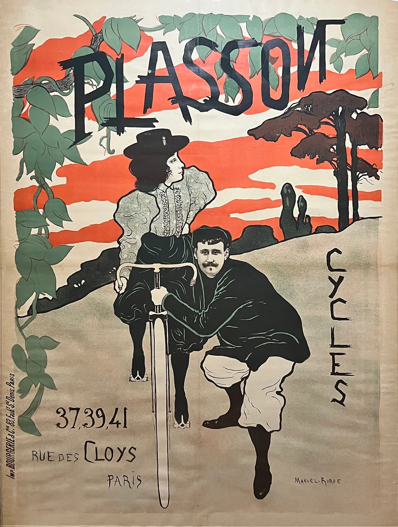 그의 독특한 양식을 보여주는 (플래송 자전거)는 프랑스의 자전거 브랜드인 플래송사의 홍보 포스터로, 붉은색의 하늘이 인상적인 작품이다. 인물의 신체와 배경요소는 평평하고 단순하게 묘사되어 있는 데 반해 두 인물의 얼굴은 세밀하게 묘사되어 있는 것이 특징이다. 또한 자전거 광고임에도 앞모습으로 일부만 묘사한 파격적인 구도 역시 독특한 특징을 보여준다. 작품 속 두 인물은 로브 자신과 아내로 알려져 있다.
