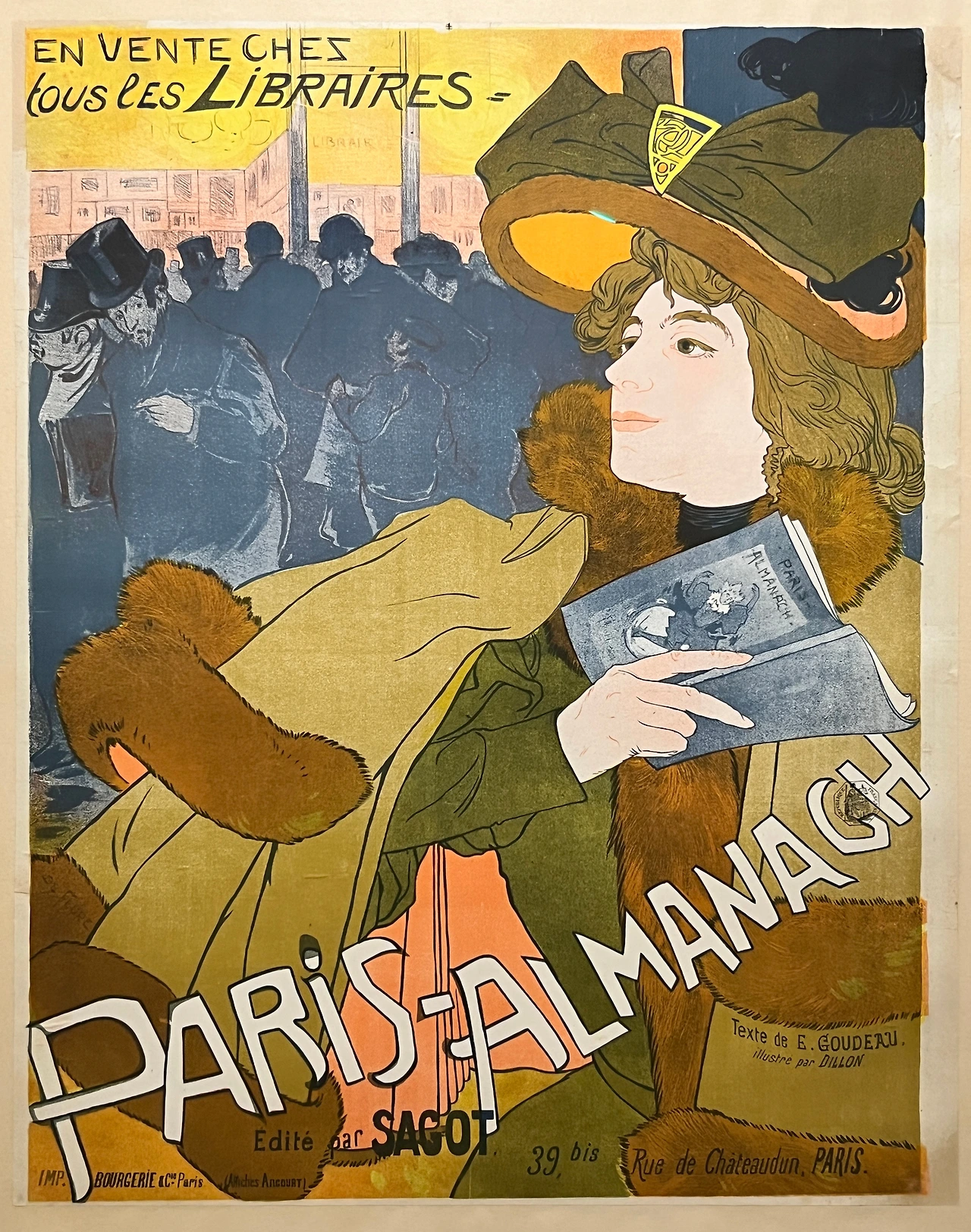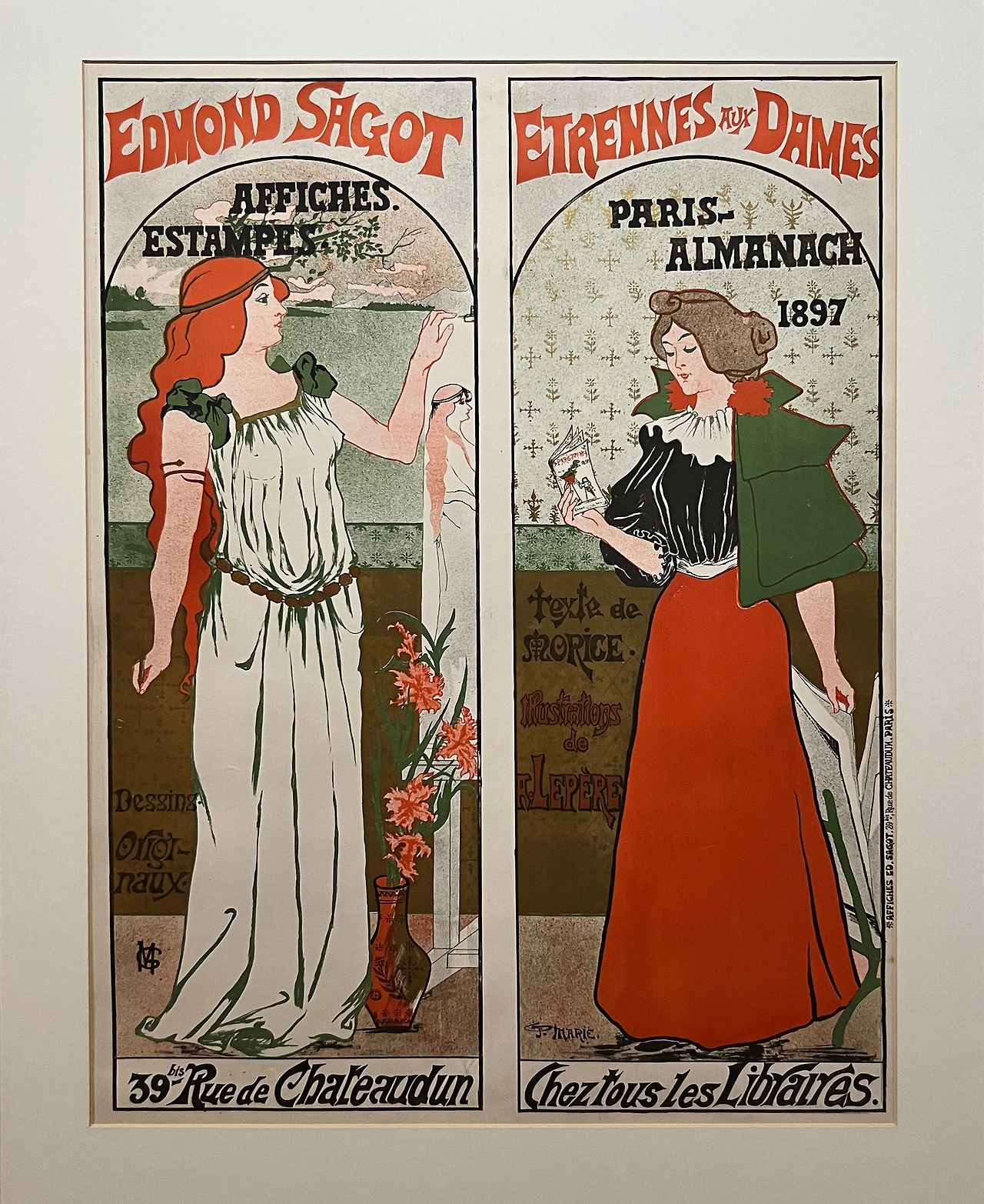 귀스타브 마리는 프랑스의 삽화가이자 포스터 디자이너로, 유머러스한 표현과 감각적인 구성을 보여준 예술가로 알려져 있다. 두 점으로 구성된 본 작품은 미술품 상인이었던 에드몽 사고가 자신의 인쇄소와 당해 출간한 책을 홍보하기 위해 의뢰한 포스터이다. 왼쪽에는 펜을 쥐고 도면을 제작하는 그리스 여인이 묘사되어 있고, 오른쪽에는 책을 읽는 여인이 묘사되어 있다. 여인이 읽고 있는 책은 1897년에 사고가 출판하였던 샤를 모리스의 저서 (파리 연감』(1897)이다. 마리는 포스터 상단에 여성들을 위한 새해 선물'이라는 문구를 통해 특히 여성 독자들을 겨냥하여 홍보하였으며, 모든 서점에서 만나볼 수 있음을 강조함으로써 광고 효과를 더하였다.