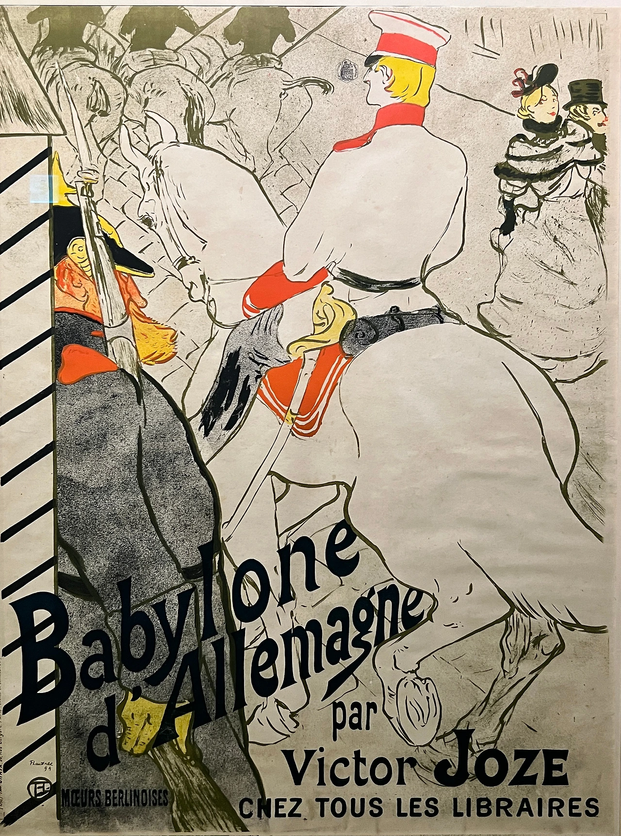 <바빌론 달레마뉴>는 프랑스의 소설가 빅토르 조제의 동명의 소설 『바빌론 달레마뉴』(1894) 출판을 홍보하기 위해 제작된 작품이다. 이 저서는 독일 부르주아 사회를 풍자적으로 다루고 있으며, 로트렉은 이를 광고하는 포스터에 총검을 들고 행진하는 독일 병사들을 표현하였다. 그는 교차되는 대각선의 구도로 역동적인 공간감을 조성하였고, 특유의 '크로핑' 기법으로 화면 상단의 기마병 행렬과 행인들의 움직임을 강조했다. 또한 전경의 말과 기병을 희게 칠하고 후경의 보초를 옅은 음영으로 표현함으로써 전경과 후경의 관계를 명료하고도 감각적으로 표현하였다. 이러한 표현법은 사람들의 이목을 끌어야 하는 포스터의 특징에 잘 부합하였다.