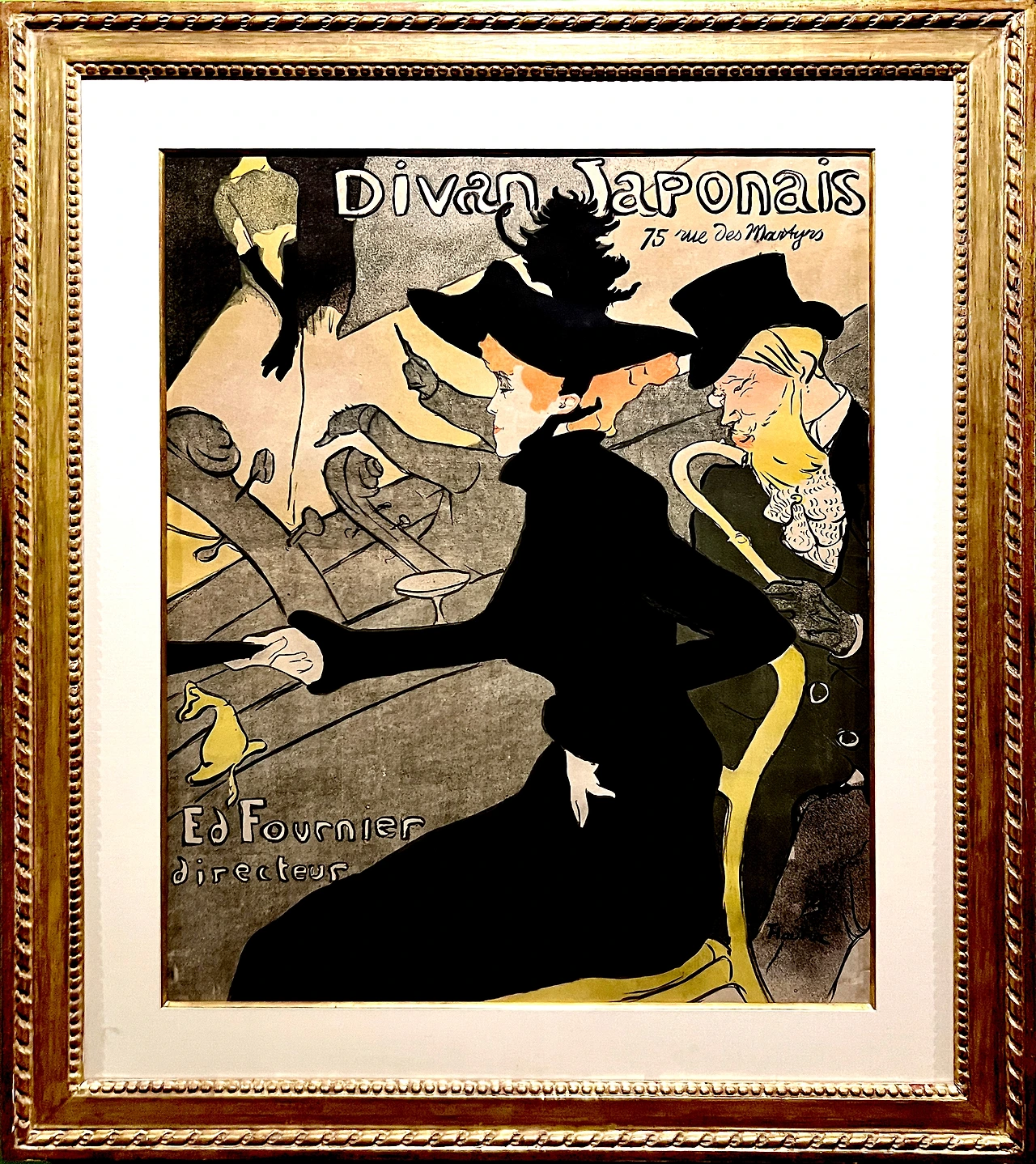 〈디방 자포네>는 프랑스의 문필가이자 극작가인 에두아르 푸르니에가 자신의 카바레 '디방 자포네'를 홍보하기 위해 로트렉에게 의뢰한 작품이다. 중앙에 앉아 있는 인물은 카바레의 스타 무용수 제인 아브릴이며, 그녀의 오른쪽에는 프랑스 문예 잡지 '라 레뷔 바그네리안느'의 창립자 에두아르 뒤자르댕이 묘사되어 있다.