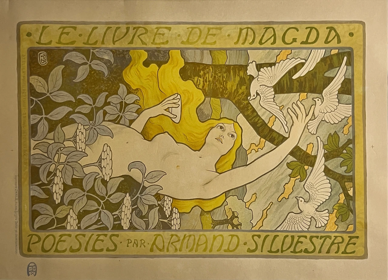 플 베르통은 포스터와 석판화를 제작하였던 프랑스의 화가로, 외젠 그라세로부터 장식 미술을 배우며 많은 영향을 받았다. <마그다의 책)은 프랑스 시인 아르망 실베스트르의 동명의 시집을 홍보하는 포스터이다. 베르통은 햇살이 반짝이는 들판에서 비둘기에게 먹이를 주는 요정을 묘사함으로써 시집의 이야기를 시각화하였다. 작품의 양쪽 측면에는 "마그다의 책"과 "아르망 실베스트르의 시집"이라는 문구가 있으며, 하단에는 베르통의 작업실 위치인 "아틀리에 폴 베르통, 당페르 로슈로 가 22번지"가 새겨져 있다.