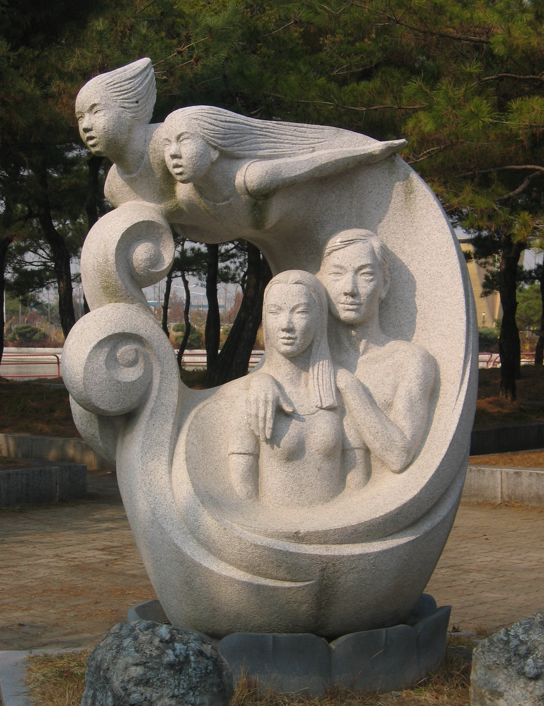 언뜻 보면 너무 전형적인 조각상이라 자칫하면 그리스 조각상의 이미테이션처럼 느껴져 스쳐 지나갈 수도 있습니다. 그래서인지 한쪽면에 작가로 보이는 동양 남자의 모습 때문에 오리지널 작품이라는 생각이 드는 이 작품은 따뜻한 메시지를 담는 이행균 작가의 작품입니다.