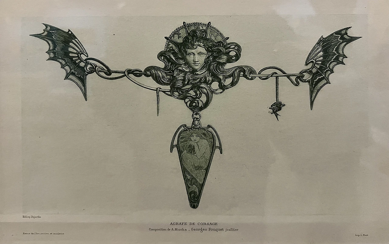 그는 무하의 연극 포스터에 등장한 화려한 주얼리 디자인에 매료되었고, 무하를 자신의 디자인 팀에 영입하였다. 1899년, 푸케는 1900년 파리 만국박람회에 선보일 주얼리 컬렉션 전체 (귀걸이, 목걸이, 반지, 브로치 등)의 디자인을 무하에게 의뢰했고, 이 성공적인 협업은 아르누보 디자인의 가장 화려한 사례로 남는다. 1901년, 부티크 푸케 (Boutique Fouquet)는 파리 로열 거리 (Rue Royale) 6번지에 문을 열었다.