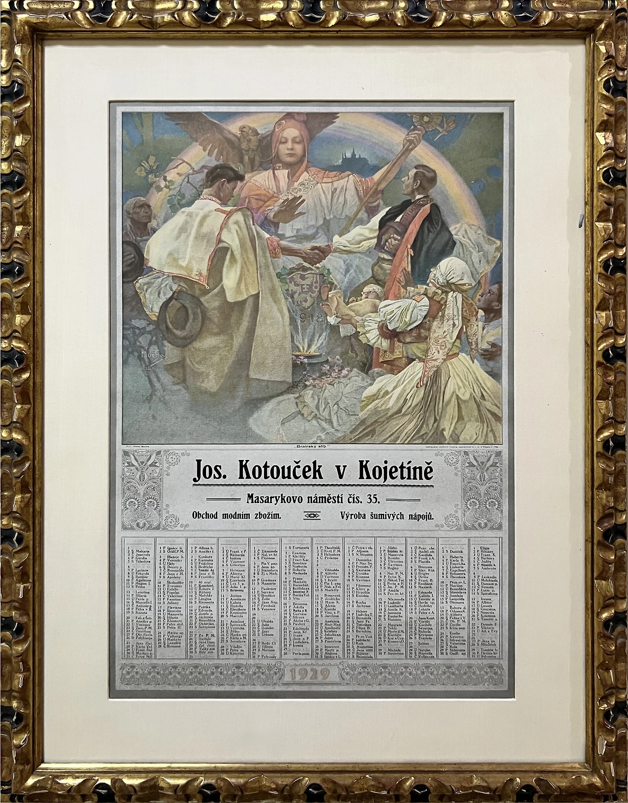 무하는 1928년에 체코슬로바키아의 건국 10주년 을 기념하기 위해 복잡한 상징을 숨긴 많은 포스터와 달력을 제작했다. <우애의 맹세 >는 무하가 보헤 미아, 모라비아, 그리고 슬라비아의 연합을 표현한 그림이다. 국경 표시 위에 두 나라의 대표가 무하의 체코 작품에 자주 등장하는 슬라비아의 보호 아래에 서 악수하며 슬라비아의 뒤로 프라하성의 윤곽이 보 인다. 두 남성의 대각선 위치에 나이 든 여성과 어린 여자아이가 보인다.