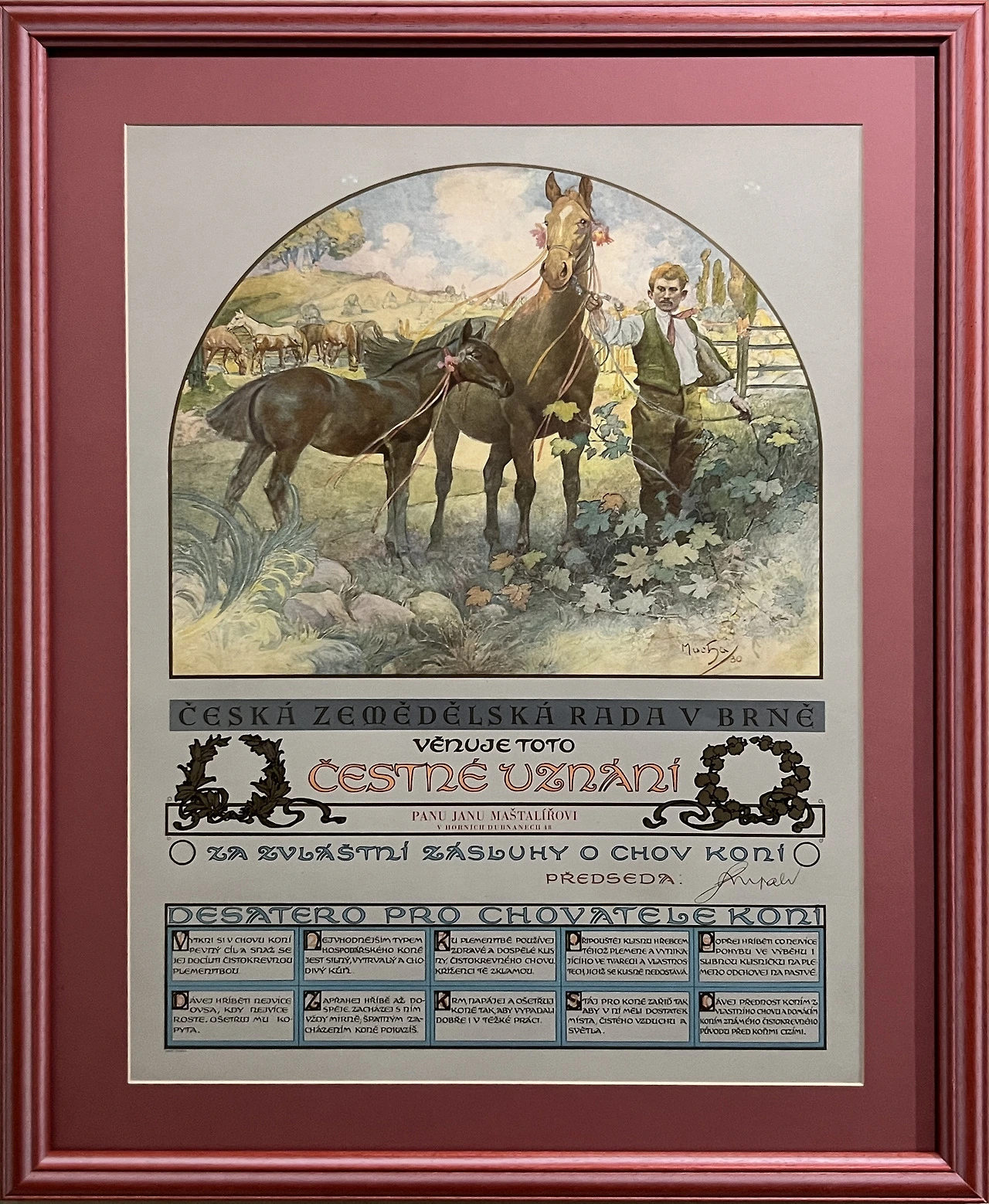 이 작품은 체코 농업 위원회가 말 사육에 대한 공로로 발행한 표창장이다. 하단에 "말 사육자를 위한