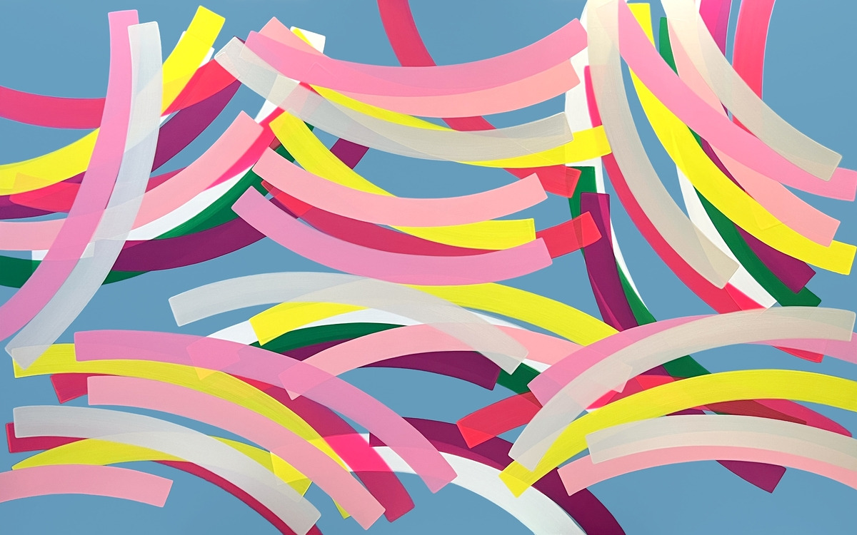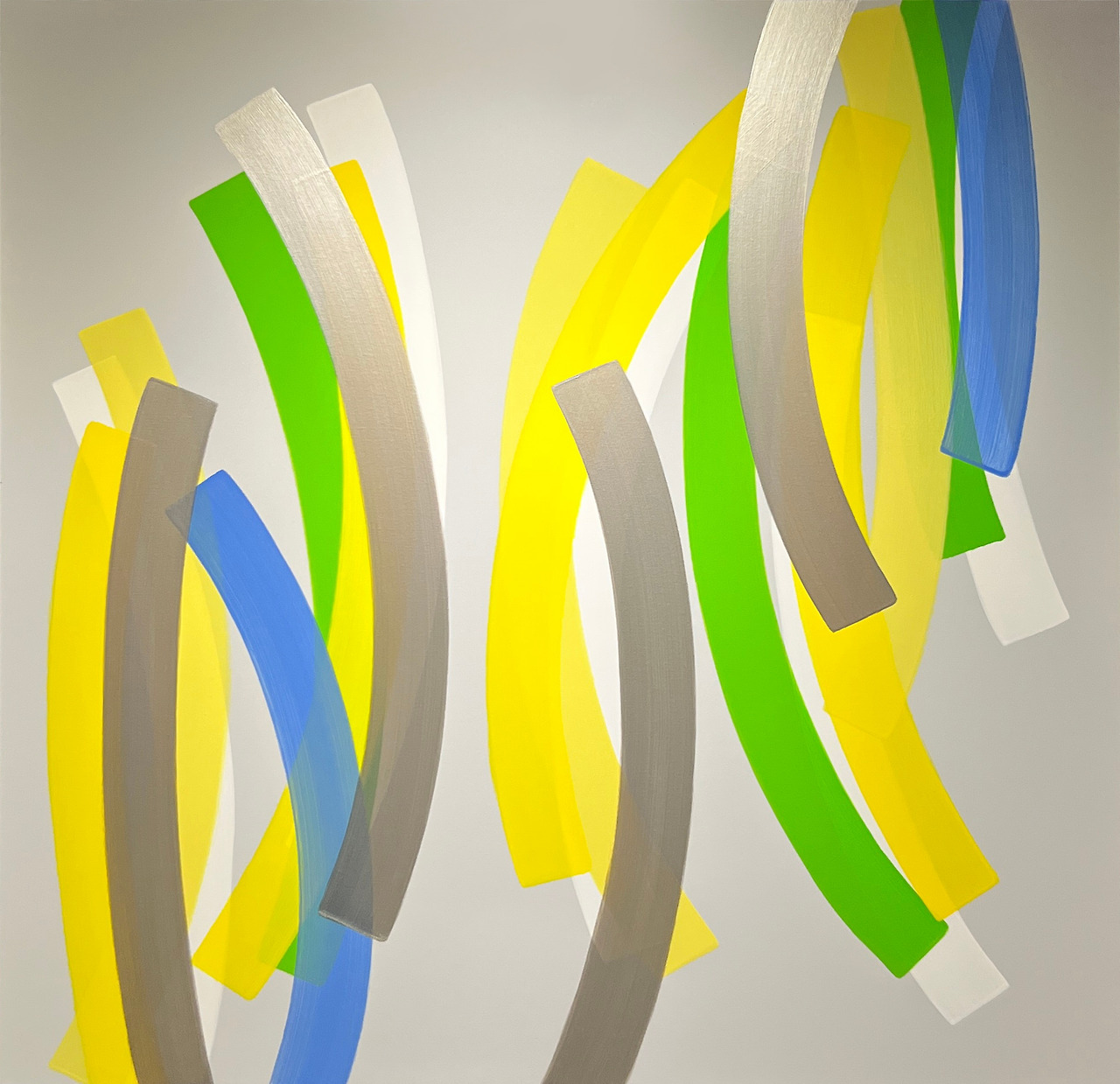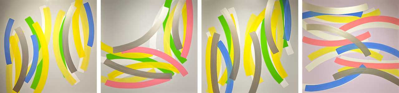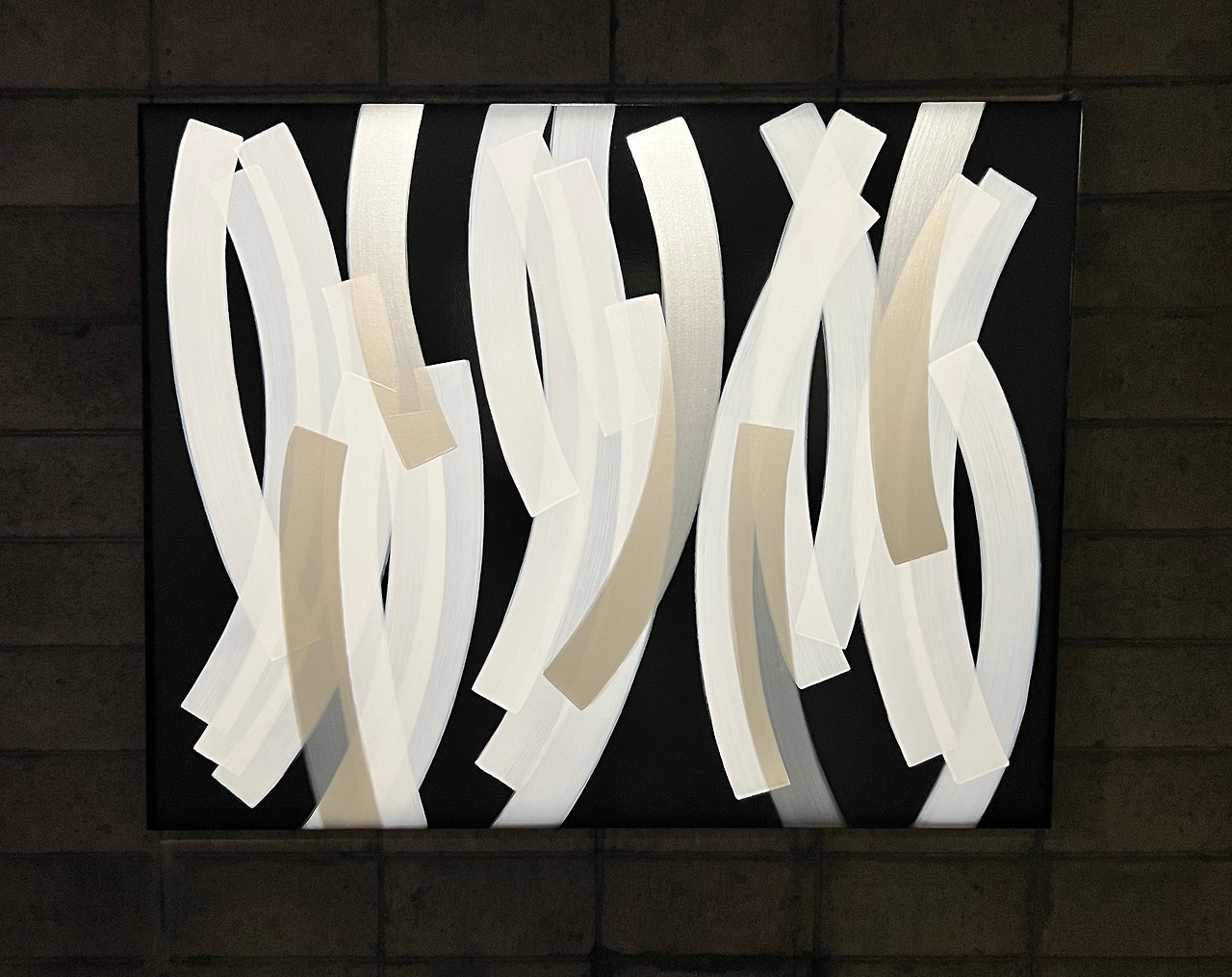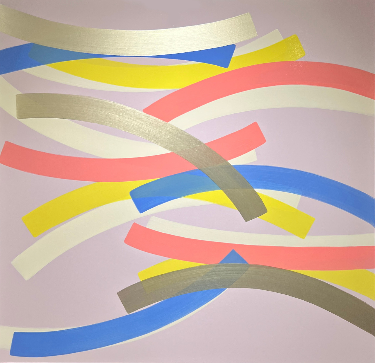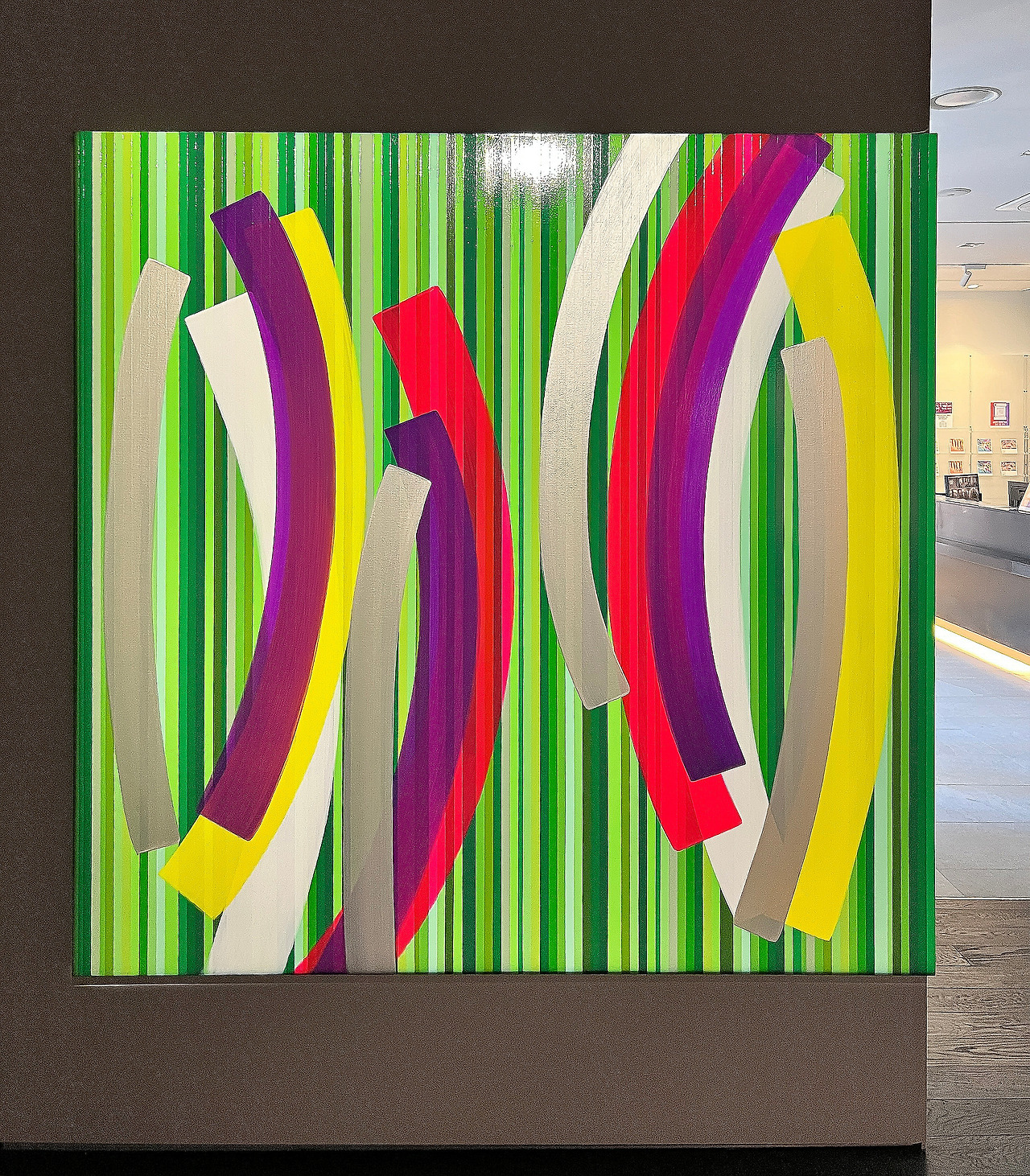 반곡면의 색띠는 단순한 형태 같지만 무한한 가능성을 품고 있으며, 일정한 리듬과 역동성을 통해 강렬한 시각적 잔상을 남깁니다. 교차하고 반복되는 색띠는 시간의 중첩을 상징하며, 경쾌하고 리드미컬한 색의 배치는 관람객에게 긍정의 에너지를 선사한디고 합니다.