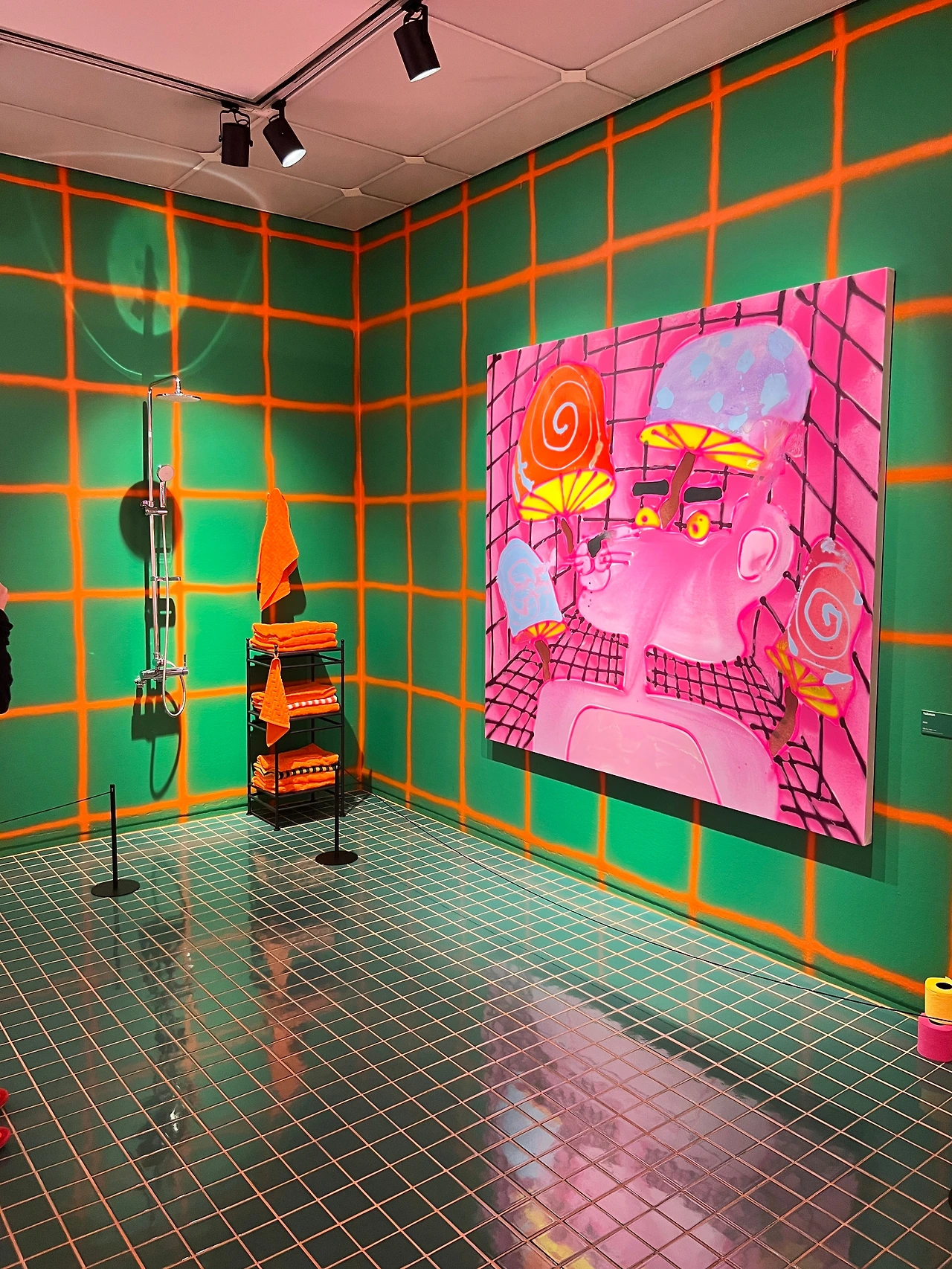 작은 욕실 안의 타일 격자는 그녀 회화의 구조이기도 하다. 일정하게 반복되는 정사각형의 네모난 타일은 이미지가 놓이는 틀이자, 혼란스러운 구성을 지탱하는 리듬이다. 하드는 이 패턴이 1970년대 이탈리아 디자인 그룹 슈퍼스튜디오(Superstudio)의 그리드에서 비롯되었으며, 그녀가 자란 80년대를 떠올리게 하는 디자인들 중 하나라고 이야기한다. 샤워실 벽면을 이루는 초록색 타일과 형광의 주황색 줄눈은 모두 그녀가 직접 고른 것으로, 그녀 작업에 등장하는 타일 모티프의 원형이 기도 하며 개인적인 공간을 회화의 배경으로 끌어들이는 방식으로 기능한다.