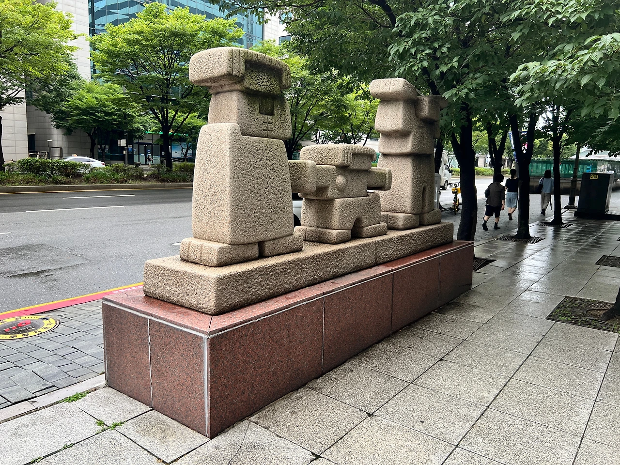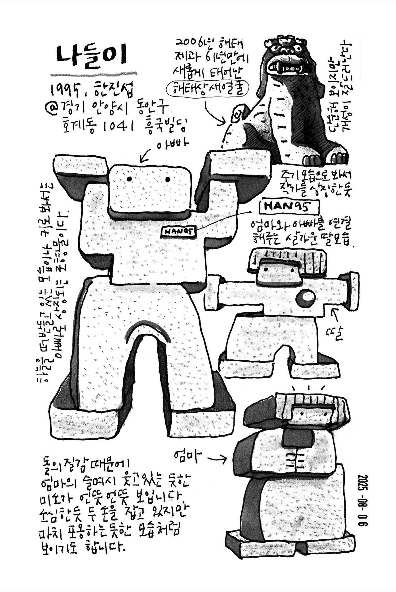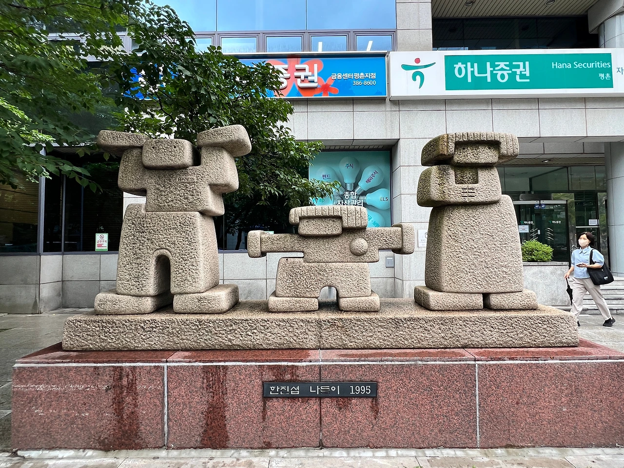 범계역 사거리에서 시민대로를 따라 평촌 방향으로 걷다보면 인도 한켠에 동글동글한 모습으로 귀여운 조각상이 놓여 있습니다. 나들이라는 이름으로 붙여 있는 이 조각상을 만든이는 한진섭 작가 입니다.
