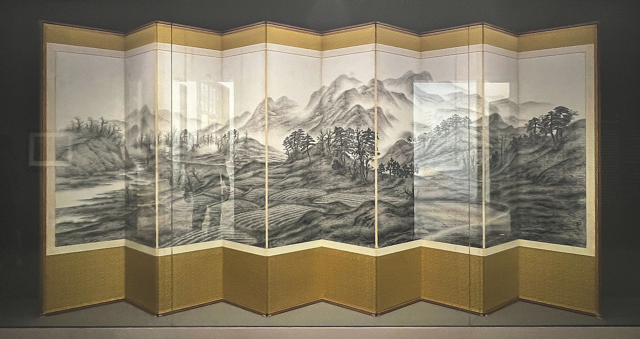 김정현, <풍경>, 1940년대, 종이에 먹, 색; 2폭 병풍, 168x94cm(x2), 부국문화재단
