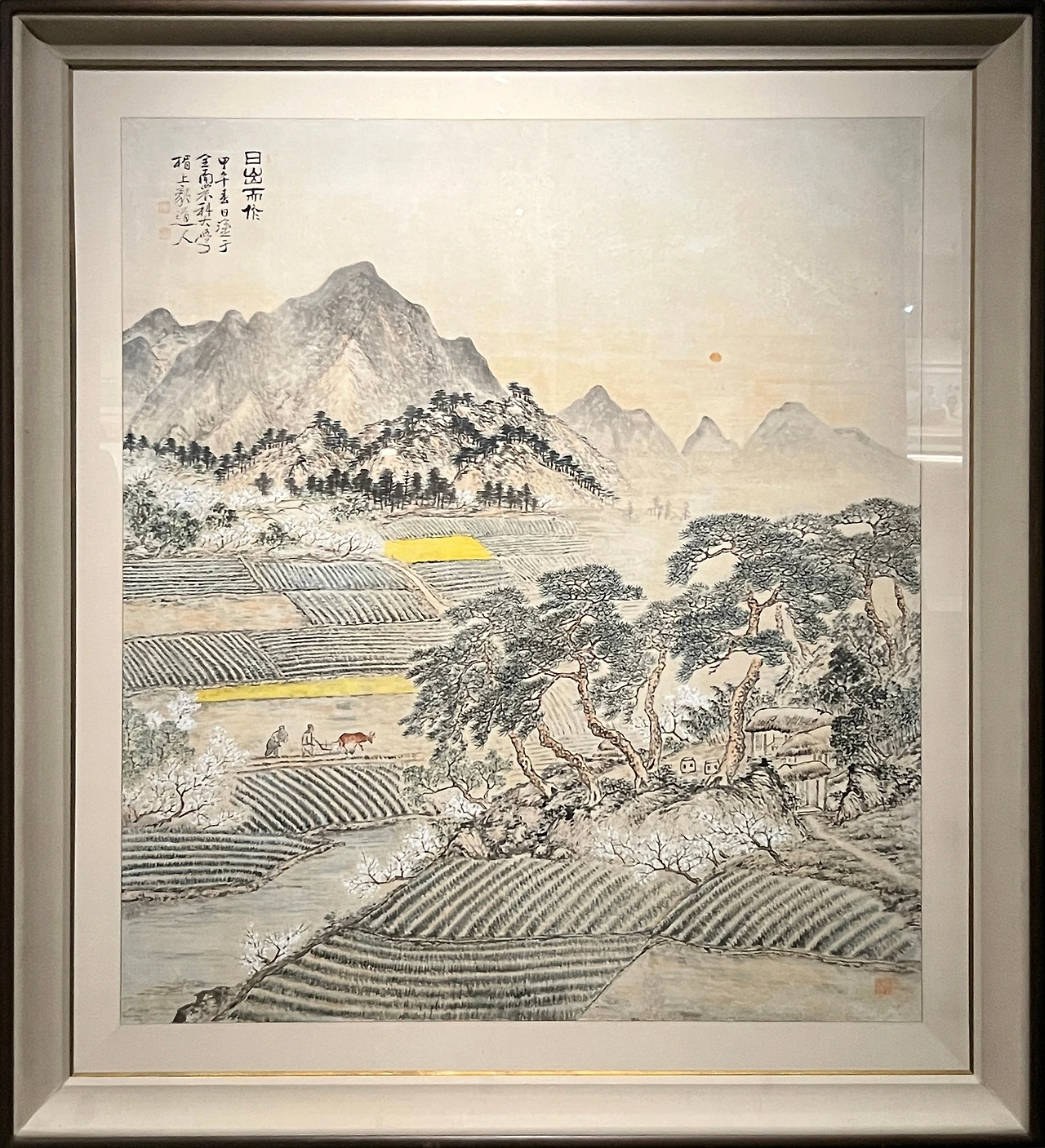 <일출이작>은 허백련이 전남대 농과대학에 기증할 목적으로 그린 농경도 작품 중 하나이다. 제목처럼 해가 뜨면 일하는 모습을 담아 쟁기질하는 남성과 씨 뿌리는 아낙을 그렸다. 무성한 소나무와 복사꽃 만발한 평화로운 봄 아침 풍경은 태평성대의 이상향을 보여주며, 농업교육과 농촌부홍운동에 대한 화가의 가치관이 담겨 있다.