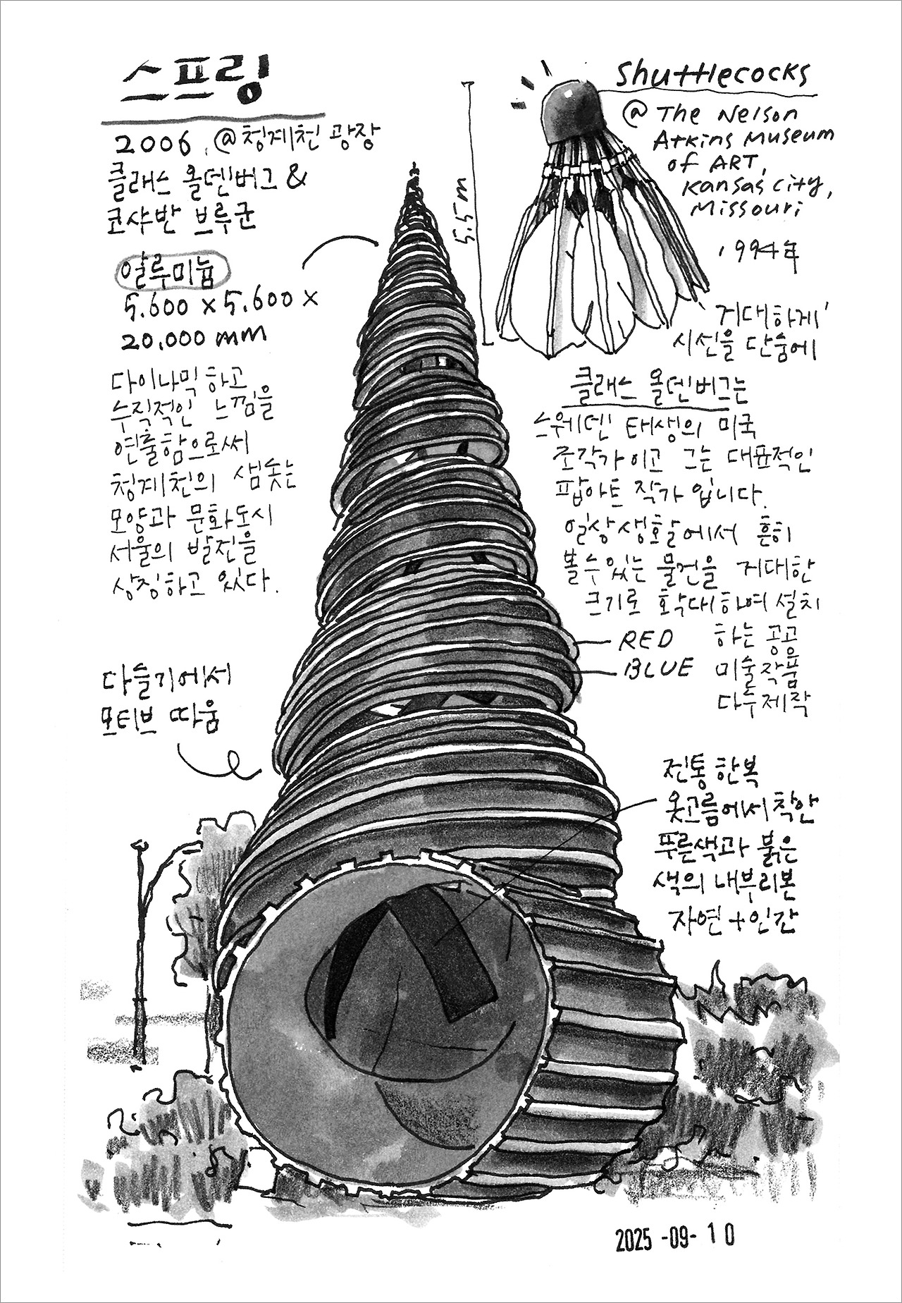 이러한 맥락에서 볼 때 <스프링> 역시 대중이 이해하기 쉬운 일상적 이미지를 통해 미술을 어려워하는 사람들의 편견을 깬 작품 같기도 합니다. <스프링> 작품은 방문객이 던진 동전, 시위용품 투척 등으로 페인트 손상과 부식이 심해 설치된 지 11년 만인 2017년, 재도색 작업을 하기도 했습니다. 광화문을 지날 때마다 많은 시민들이 <스프링> 앞에서 기념 촬영을 하거나 동전을 던지는 등 즐거운 시간을 보내고 있는 모습을 봅니다. 일상이 예술이 되는 순간, 그것이야 말로 작가가 진짜 원했던 것은 아닐까요?