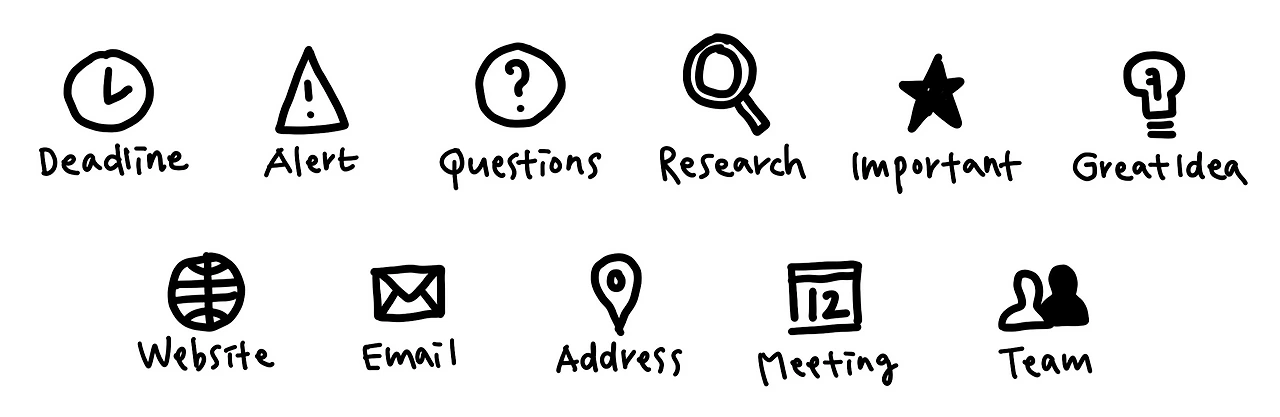 직무, 산업 또는 관심 분야에 맞는 아이콘 모음을 직접 만드는 것은 자신의 사고방식과 업무 방식에 더 잘 맞는 아이디어를 태그 하는 좋은 방법입니다. 교육, 법률, 비즈니스 분야의 아이콘은 다음과 같습니다.