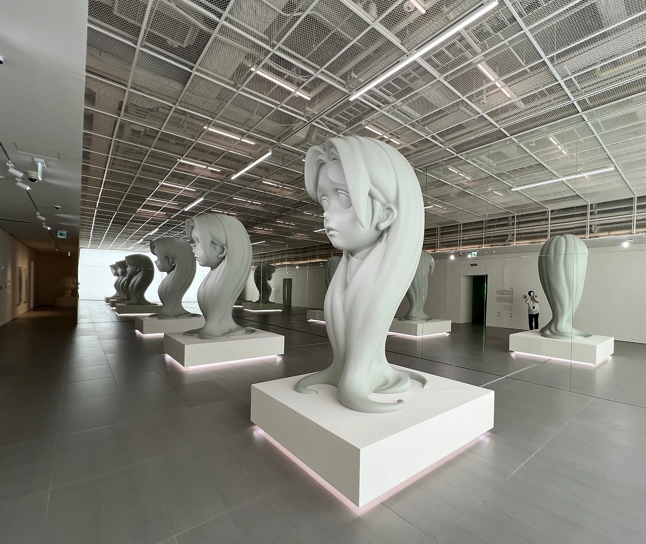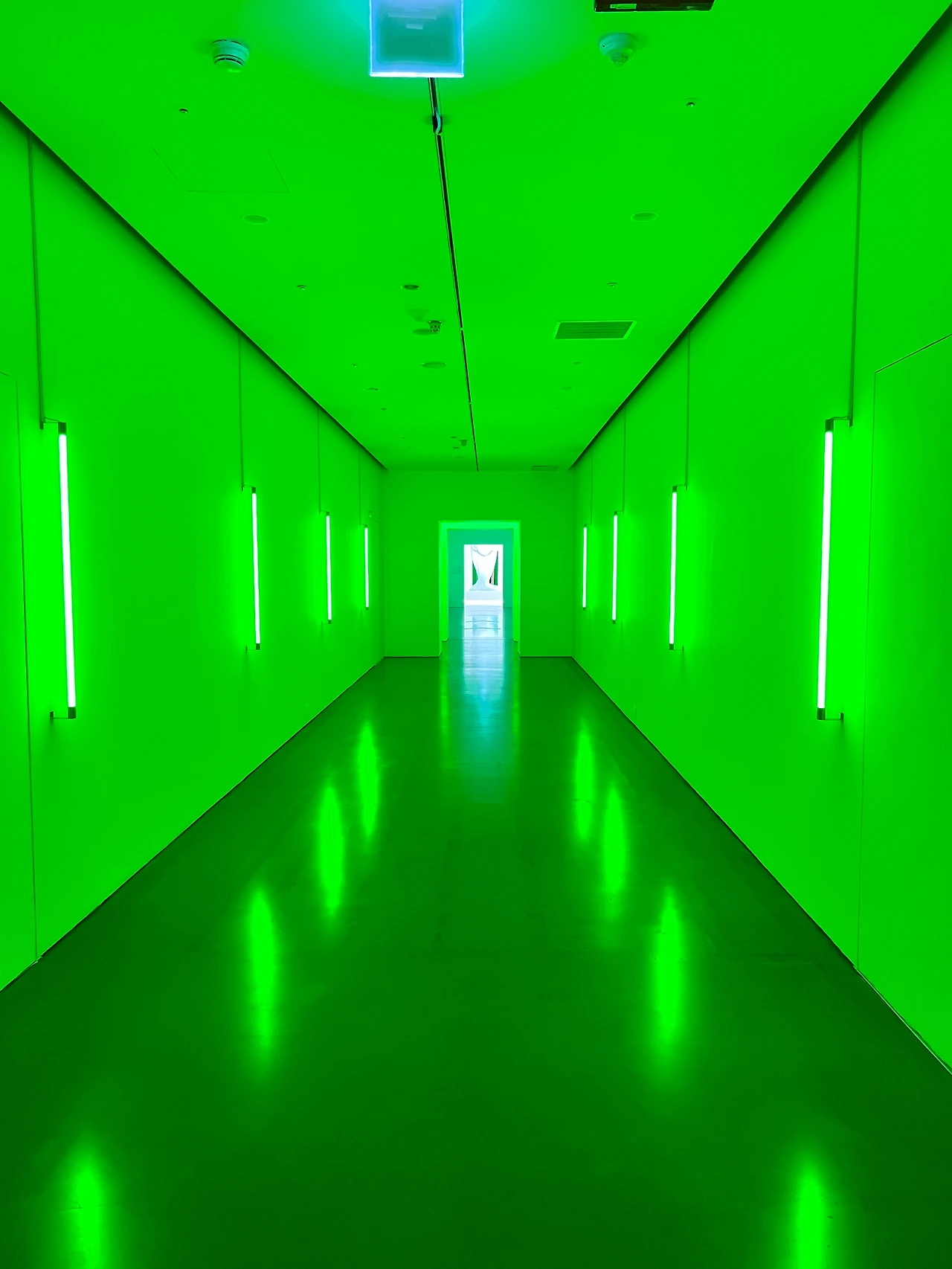 녹색은 도스 시절의 녹색 글씨이거나, 매트릭스에서 나왔던 디지털 글자들이 연상되어 마치 아날로그 공간에서 디지털 공간으로 이동하는 기분이 들었습니다. 제법 긴 녹색보도의 끝에는 얼핏 조각상 같은 모습이 보입니다. 이 중앙 공간에 다시 와서 다른 방으로 갈 수 있는 비효율적인 구조가 재미있었습니다.