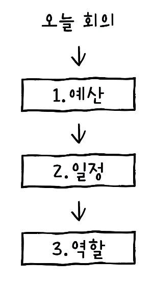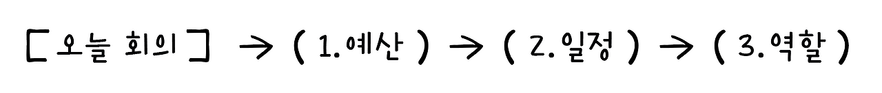 오늘 회의에서는 세 가지를 논의했어요. 첫째, 예산 문제. 둘째, 일정 조정. 셋째, 역할 분담입니다."