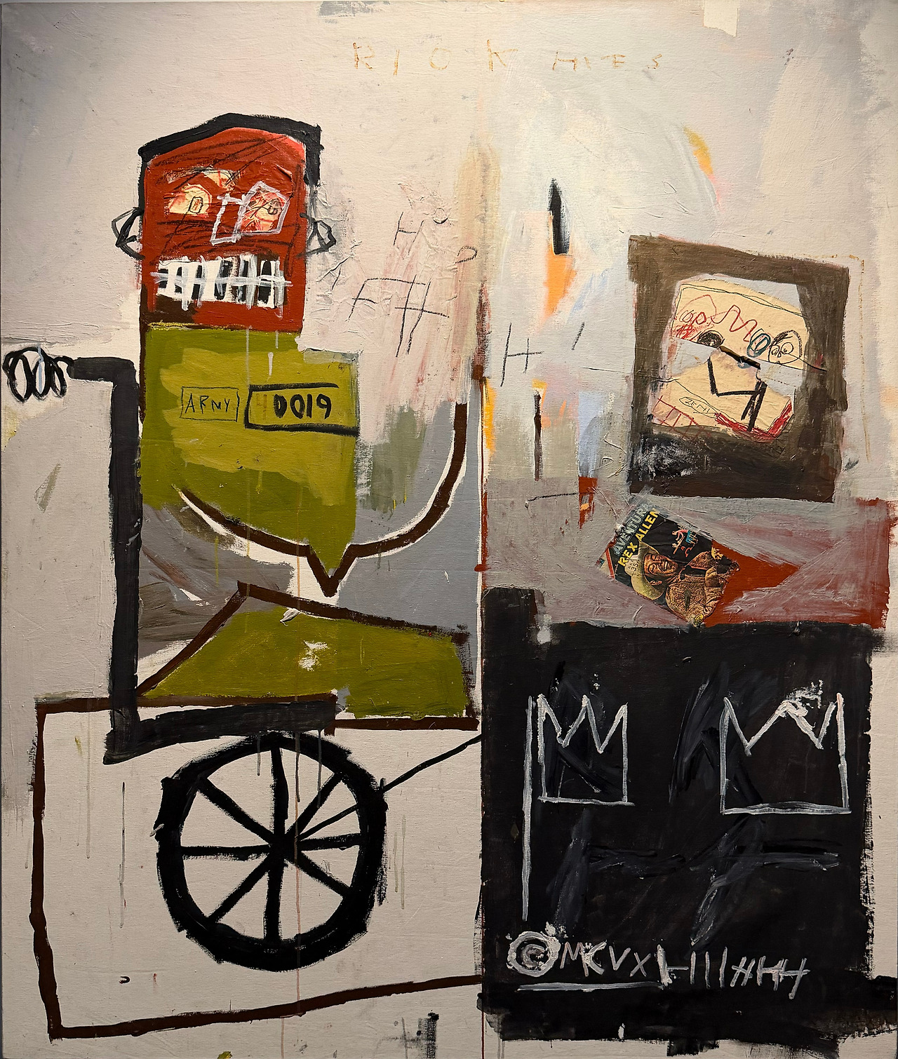 이후 바스키아는 엽서, 콜라주, 티셔츠뿐 아니라 냉장고, TV, 거울, 버려진 창문과 같은 일상적 오브제에 그림을 그리며 전통적 매체의 경계를 확장했다. 그의 초기 회화는 그라피티처럼 역동적이고 즉흥적인 선으로 가득 차 있어, 마치 화면 전체가 살아 움직이는 듯한 에너지를 전달한다.
