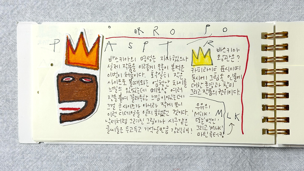 바스키아의 명성은 자자했으나 실제 작품을 이렇게 많이 본적은 이번이 처음입니다. 확실히 작은 사이즈로 볼 때와는 엄청난 차이를 느낄 수 있었는데, 메모장 여러 장을 붙여 꼴라주한 느낌의 작품을 큰 사이즈가 아니라 작게 보니 디테일들을 알지 못했던 것 같습니다.