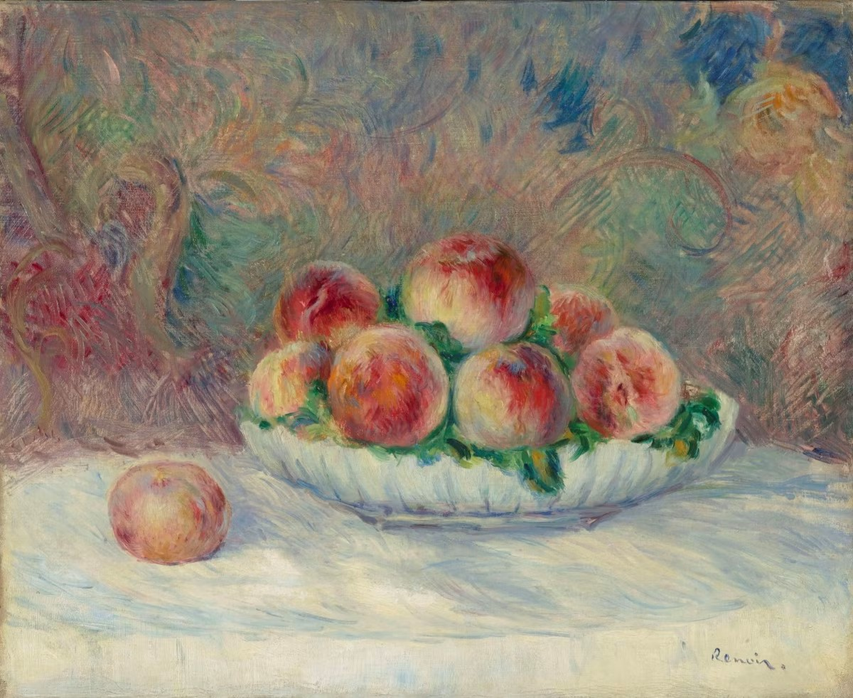 르누아르의 <복숭아>(1881)는 반짝이는 자기에 담긴 복숭아의 솜털처럼 부드럽고 섬세한 촉감을 그대로 전해준다. 르누아르는 십 대에 도기 공방에서 수습생으로 일하면서 자기 채색 특유의 맑은 색상을 다루는 경험을 쌓았다. 그 덕분에 광채를 표현하는 평생의 기술을 터득했고, 어른거리는 빛을 능숙하게 묘사할 수 있게 되었다.