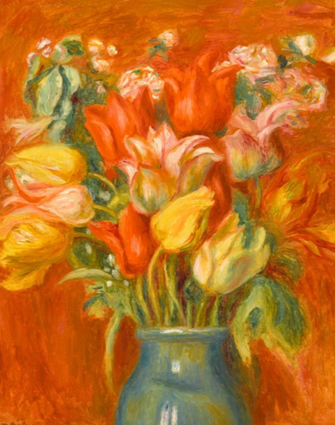 르누아르는 꽃다발을 그리는 것을 좋아했는데, 다양한 꽃꽂이를 통해 형태와 색상을 연습했습니다. 그는 다양한 종류의 꽃을 섞어 원하는 배열을 만드는 것을 즐겼습니다. 르누아르는 또한 모양의 배치와 원근법에도 많은 주의를 기울였습니다. 꽃병과 꽃다발은 옆모습으로 보이는 반면, 그 위에 놓인 원형 테이블은 위에서 내려다보는 것처럼 보입니다. 이는 깊이감을 없애는 갈색의 평평한 부분이 이를 보여줍니다.