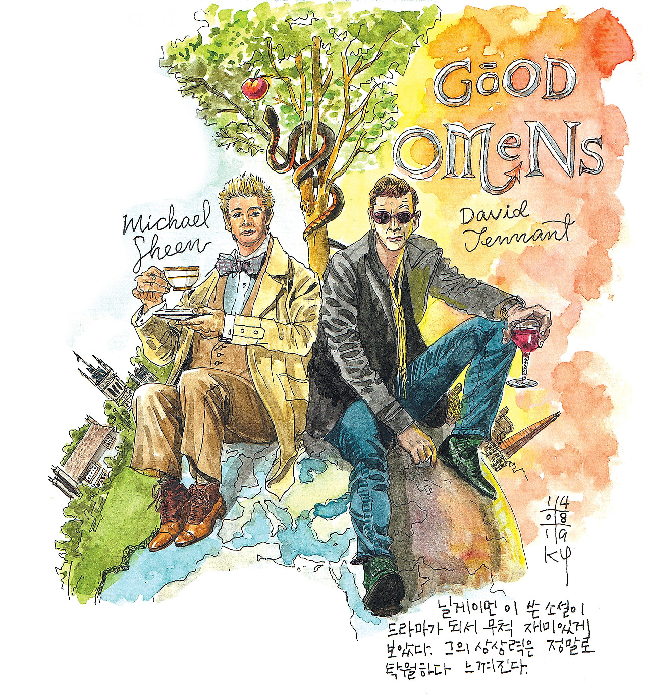 악마 크롤리는 식물을 키우고, 자동차를 무척 좋아하는 천사 아지라파엘은 초밥, 음악을 좋아하며 고서 가게를 운영합니다. 악마의 자식이 태어나 '아마겟돈'을 하기로 잡혀 있었는데 미국 대사 부부의 아들로 바꿔치기해야 하는 미션부터 실수해놓곤 전혀 눈치채지 못하고 둘이 곁에서 선과 악의 영향을 끼쳐 종말을 막거나 지연시킬 계획을 짜게 됩니다. 그런데 뒤늦게 아이가 바뀌었다는 사실을 알고 다양한 사건들이 터지는데 정말 다채롭게 이야기가 전개됩니다.