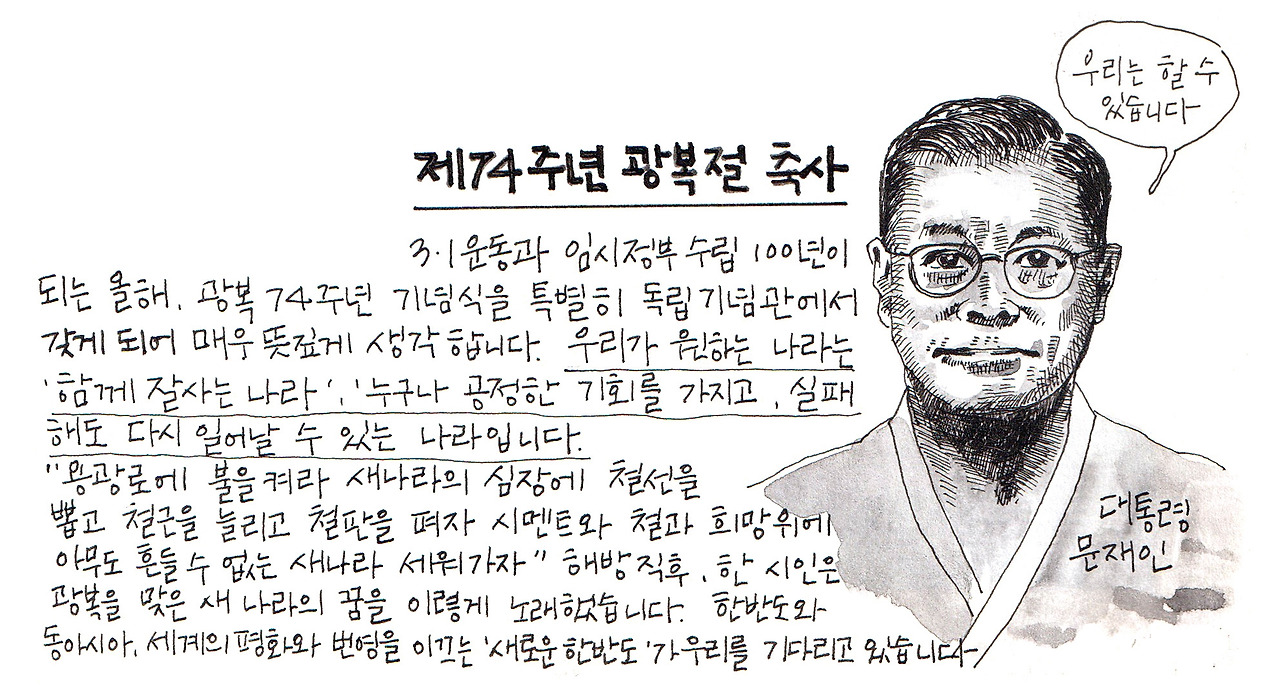 31운동과 임시정부 수립 100년이 되는 올해. 광복 74주년 기념식을 특별히 독립기념관에서 갖게되어 매우 뜻깊게 생각 합니다. 우리가 원하는 나라는 '함께 잘사는 나라', '누구나 공정한 기회를 가지고, 실패해도 다시 일어날 수 있는 나라' 입니다.