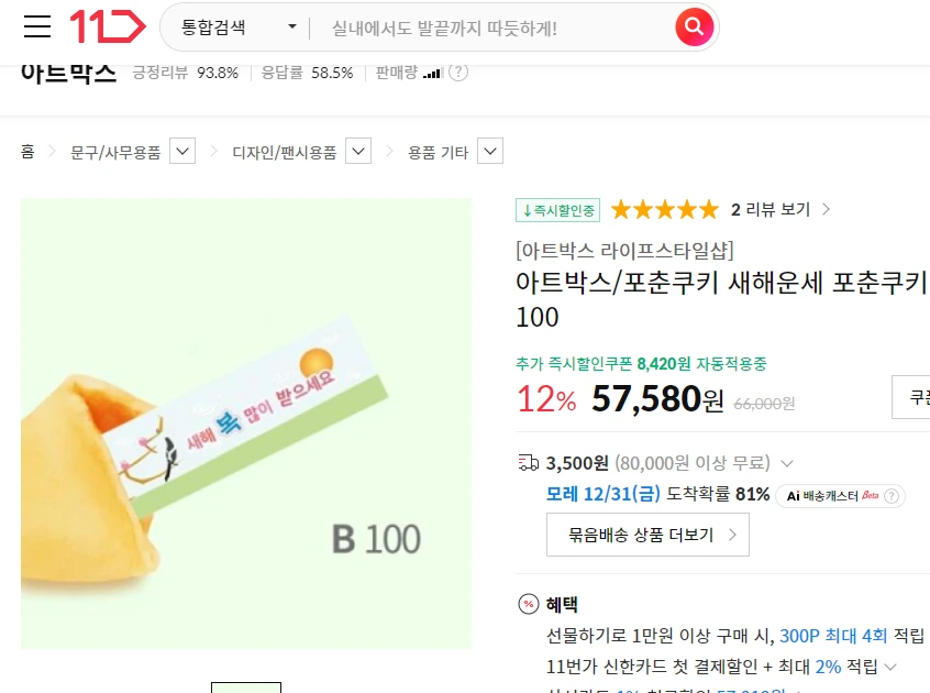 바로 포춘쿠키입니다!! 저는 100개 들이를 6만 원 정도에 구매하였으니, 1개를 선물한다고 하면 600원 정도면 충분하겠죠.