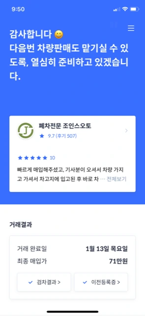 그래서 제 차에 관심을 보여주신 여러 딜러분들 중에서 폐차를 전문으로 하신다는 딜러분을 선택했습니다. 5명의 딜러분이 입찰을 하셨는데, 최저 55만 원에서 최대 95만 원까지 제시를 해주셨습니다. 마음 같아서는 95만 원을 받으면 좋겠지만, 그것은 불가능해 보였고, 그래서 71만 원을 제시하신 폐차 전문 딜러분을 선택했습니다.