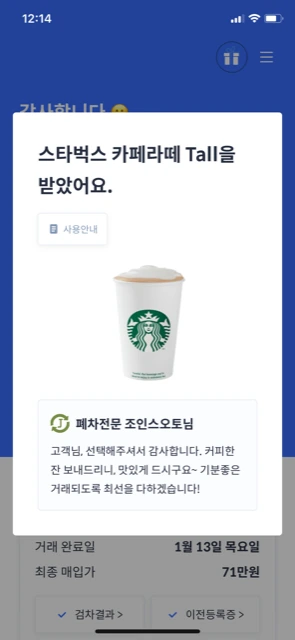 딜러분을 선정한 이후에는 일사천리로 진행이 되었습니다. 일단 스타벅스 음료 쿠폰을 보내주셨고, 다음날 오전에 바로 저희 아파트 주차장에 오셔서 차량을 가지고 가셨습니다. 차량을 가지고 가셔서 차고지에 입고가 확인된 후에는 약속하셨던 71만 원을 바로 지급해주셨습니다. 그리고, 다음날에는 차량등록 말소 서류를 보내주시면서, 말소 등록 서류를 보내어 기존의 자동차 보험을 해지하는 것에 대해서도 안내해주셨습니다.