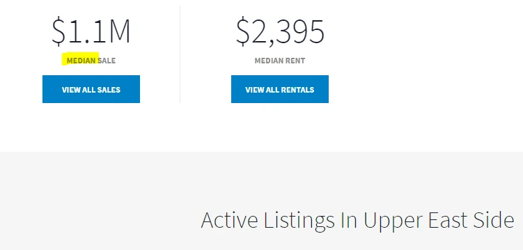 시험 점수만이 아니다. 부동산 가격이나, 임금도 마찬가지였다. Streeteasy.com이라는 웹사이트에서는 뉴욕시의 부동산 매물들을 모두 검토해볼 수 있다. 그런데, 이 사이트에서도 어떤 지역을 선택하면, 그 지역의 부동산 가격의 중간값(Median)을 알려준다. 예를 들어, 뉴욕시에서 가장 전통적인 부촌 중 하나인 어퍼 이스트 사이드 (현재 최고 매물의 가격이 700억을 훌쩍 넘는다.) 지역 부동산의 중간 가격은 약 13억 원($1,100,000)이다. 그리고, 이 지역에 사는 사람들의 월급의 중간값은 1억 5천만 원($131,000) 정도라는 정보도 함께 제공된다. 사람들은 이처럼 중간값에 대한 정보를 바탕으로 해당 부동산이 지역의 시세에 부합하는 물건인지, 자신의 월급 정도면 이 지역에서 생활하기에 적합한지를 판단한다.