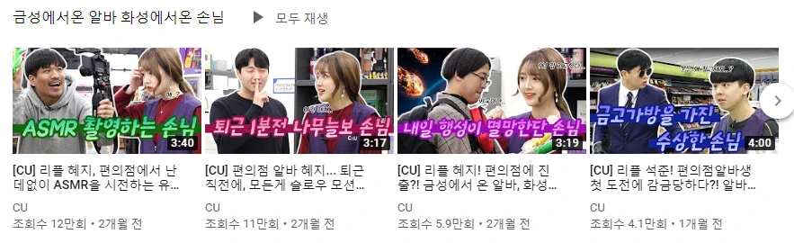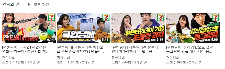 역시 편의점은 트렌드에 가장 민감한 곳이라 그럴까요? 유튜브 컨텐츠 발행에 대해 3사 모두 적극적이었습니다. 각 채널별 평균 구독자수와 영상수가 높은 편이었습니다. 영상 종류도 다양하여 MD가 직접 나와서 상품에 대해 설명하는 컨텐츠, 스토리형 컨텐츠 등 광고가 아니더라도 궁금하여 볼만한 영상들이 있었습니다.