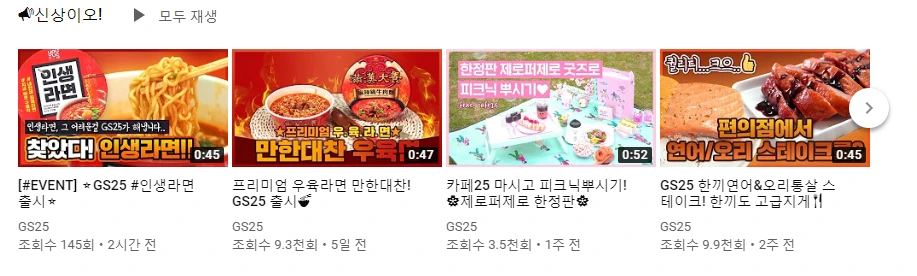 편의점은 타유통사 대비 신박한 신상이 많이 나오는 채널입니다. 트렌드가 가장 먼저 반영되는 공간이라 그럴까요?그래서 GS25는 신상관련 sns영상도 많은데요, 이 sns영상도 유튜브용으로 다시 만들어서 유튜브에서 편의점 신상을 검색하면 바로 찾을 수 있겠끔 했습니다. 타 편의점들에 비해 유튜브에서 신상관련 검색이 잘되는 편입니다.