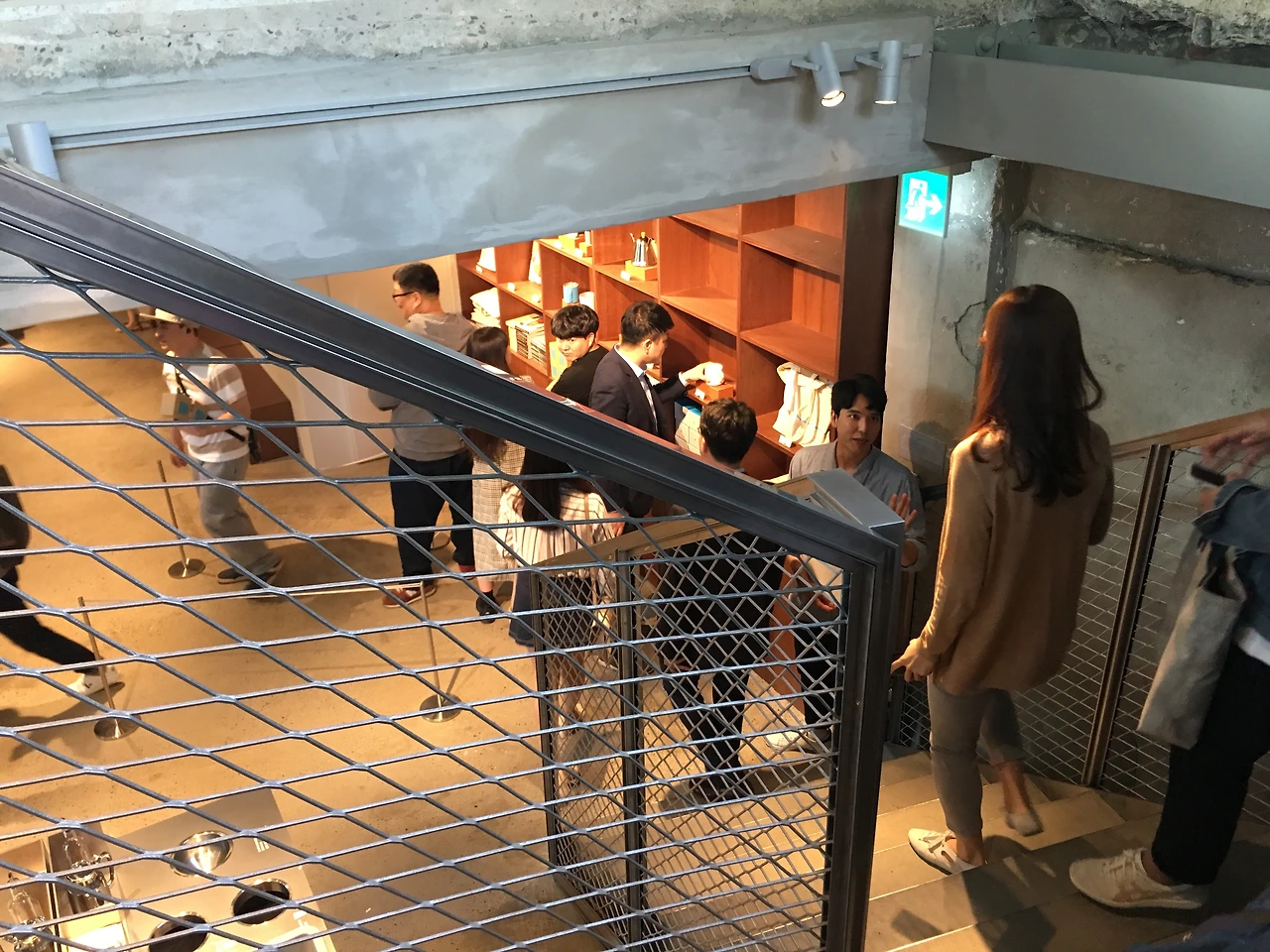 계단 쪽으로 내려가도 된다는 직원분의 안내에 계단으로 입장했다. 아니, 계단을 지키는 직원만 2명이라니. 내가 놀이기구를 기다리는 건가라는 착각이 생길 정도였다. 롯데월드에는 아틀란티스라는 놀이기구가 있는데, 그곳 또한 뙤약볕에서 1시간 정도를 기다리고 실내에서도 또 기다리게 된다. 그런데 이 블루보틀에서도 누구 하나 불평하지 않고 직원들의 안내에 잘 따랐다.