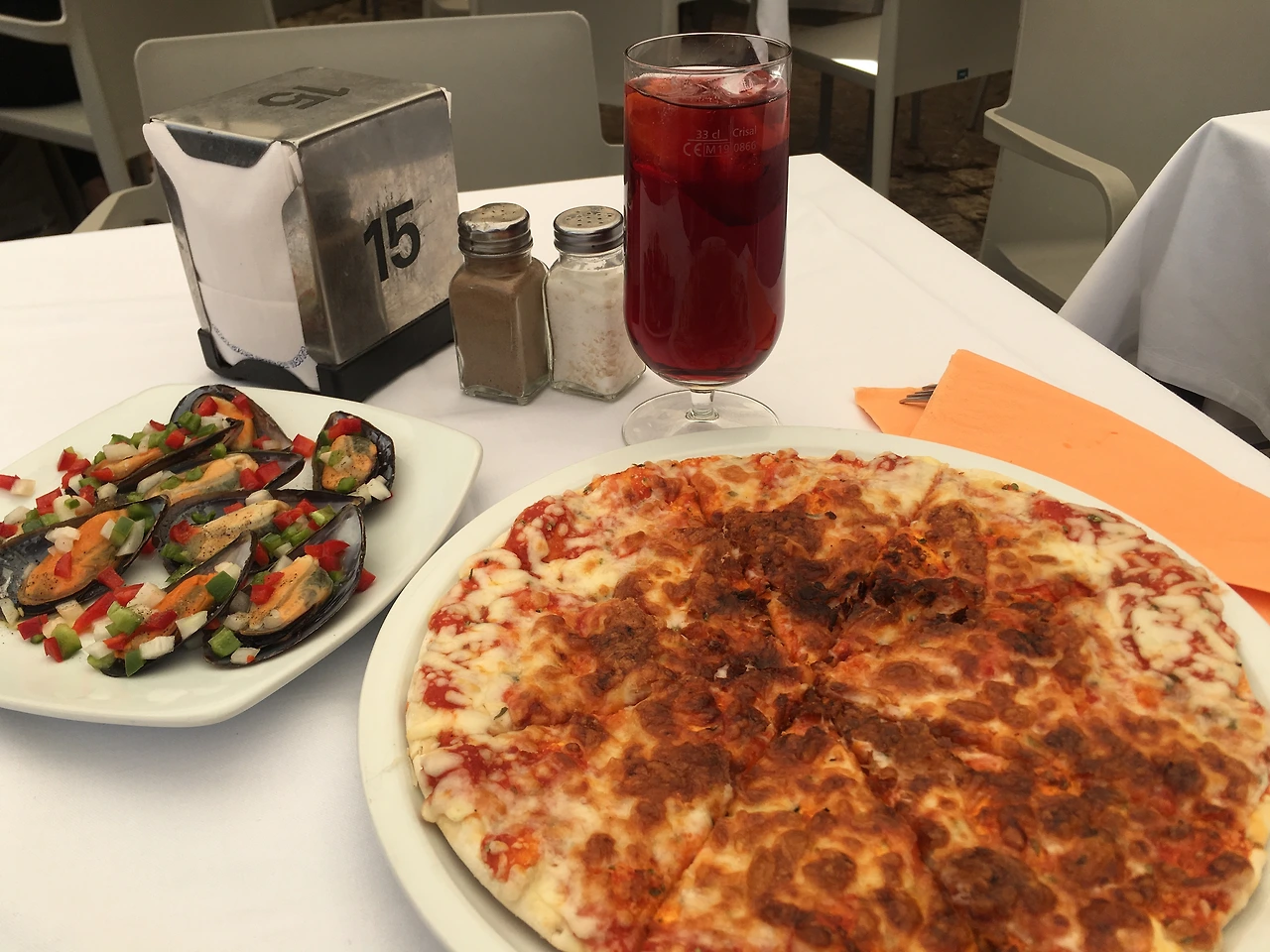 난 여러 테이블 중 내가 앉고 싶은 곳은 아무 곳에 앉았다. 그리고 종업원 아저씨에게 피자를 추천받은 후 타파스 홍합(6유로)과 메인 요리용 칮 피자(10유로) 그리고 샹그리아(5유로)를 주문했다. 원래 처음 주문할 때는 마드리드에 처음 온 기념으로 리뷰 영상을 찍으려 했다. 그런데 유럽을 즐기려 온 내가 영상을 찍기 위해 5분 전에 나온 홍합을 못 먹고 바라만 봐야 한다는 것이 퍽 슬퍼졌다. 그래서 영상을 안 찍기로 결심한 후 홍합을 먹기 시작했다. 미친 홍합은 미친 맛이었다. 너무 맛있는 거다. 그냥 살아있는 채 입안에서 그대로 슬라이딩하는 느낌이랄까! 이보다 완벽한 주문은 없었다. 그리고 홍합만 먹었으면 느끼할 것을 치즈피자로 잡아주니 잘 익은 피자에 홍합을 얹어 먹는 느낌이랄까? 마치 오랫동안 가고 싶던 맛집에서 먹는 음식 같았다.
