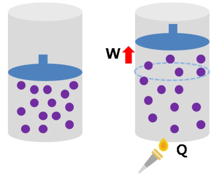 기체가 내부에 들어있는 피스톤이 있다고 생각해보자. 기체는 들어오거나 나가지 않지만, 열 에너지는 내/외부에서 들어오거나 나갈 수 있다고 하자. 이 피스톤에 열(Q)을 가한다면, 피스톤 안의 기체 분자들은 열의 형태로 에너지를 전달받아 높은 에너지를 갖게 되고, 활발하게 움직이게 된다. 좁은 공간에서 활발하게 움직이는 만큼 피스톤 경계에 부딪히는 횟수가 많아지고, 피스톤을 밀어 올리는 힘이 강해진다. 이것을 '압력'이 커졌다고 한다. 압력이 커지면 피스톤이 올라가며 피스톤 내부의 기체 분자들이 차지하는 공간, '부피'가 커지게 된다. 부피가 충분히 커지고 나면 기체 분자들이 피스톤 경계에 부딪히는 횟수가 줄어들어 압력이 이전과 같아지게 된다.