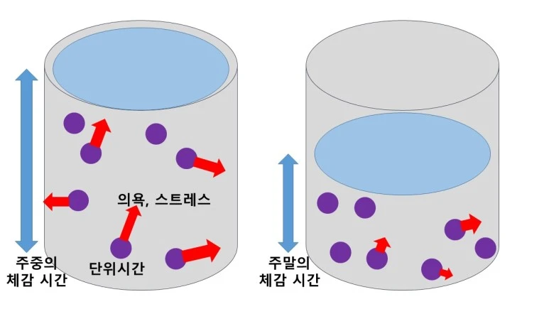 외부로부터 매일 공급되는 열 에너지(하루 식사량)는 일정하다고 가정하자. 보통 주중을 과제와 업무에 시달리며 지내다 보면, 매일 공급되는 열 에너지(식사량)에 비해 에너지 손실량이 더 커지게 되어, 피스톤 내부 단위 시간 분자들이 가진 에너지양이 감소하게 된다. 말하자면, 각각의 1시간을 의욕적으로 보낼 수 있는 에너지가 감소하게 되는 것이다. 단위 시간 분자들이 가진 에너지양이 감소하면, 피스톤의 압력도 따라서 감소하고, 압력의 변화 때문에 부피(체감 시간)도 감소하게 된다.
