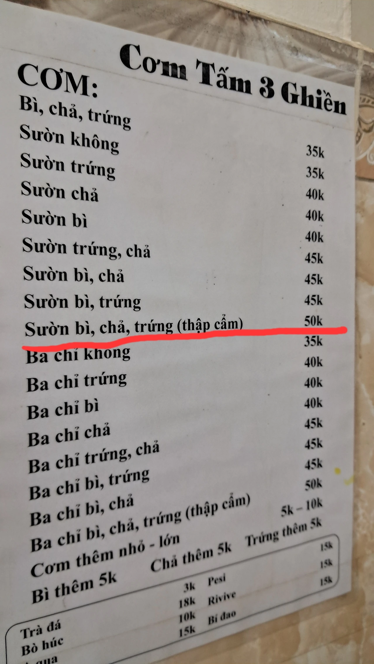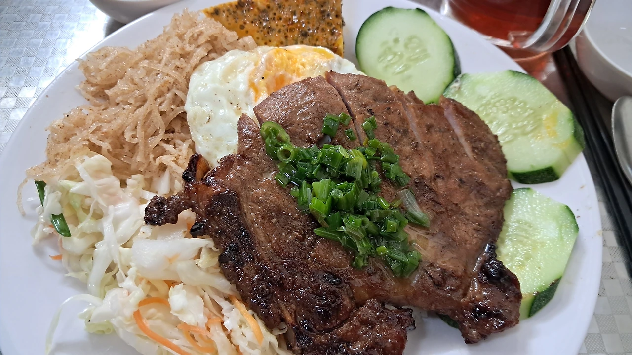 아래 메뉴가 야시장 인근 현지인 식당에서 가장 비싸게 판매되는 메뉴인 '껌땀'이다. LA갈비와 흡사한 돼지갈비를 숯불에 구워 밥과 함께 먹는 메뉴다. 5만 동, 한화 2,900원. 물론 이곳 역시 영어가 전혀 통하지 않는 식당이었다. 식당 내부, 3개 테이블에 현지인이 있는 걸 보고 들어갔고, 맛은 예상대로 보장된 곳이었다.