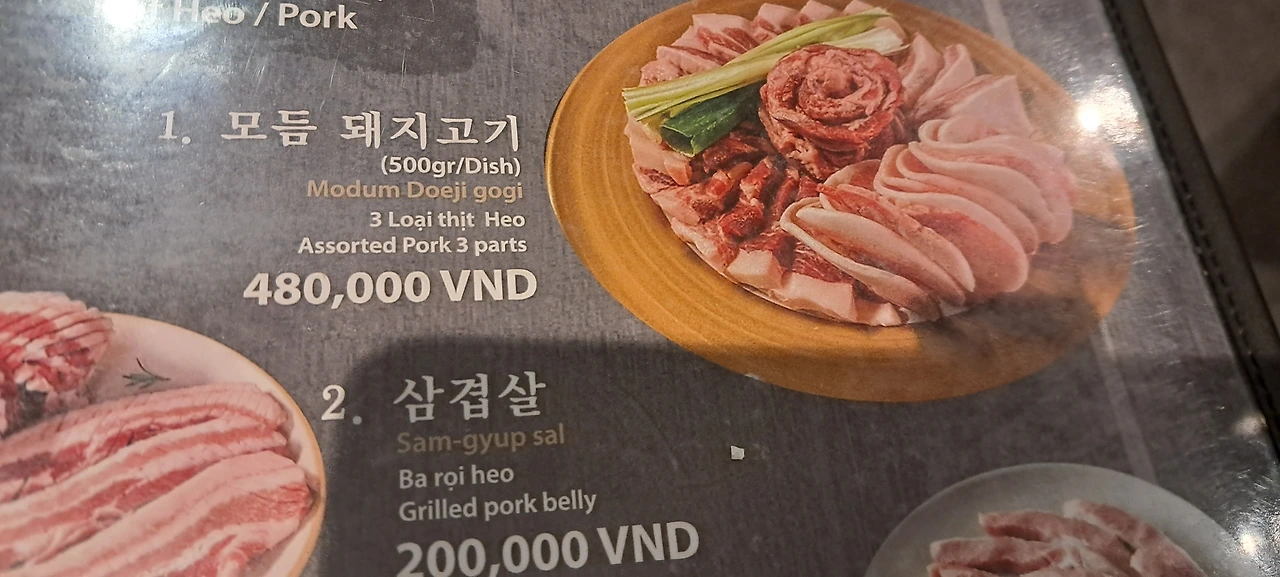 모둠 돼지고기 500g에 48만 동(한화 27,500원)+ 돼지고기 김치찌개 16만 동(한화 9,200원) =합계 64만 동(36,700원)이다.
