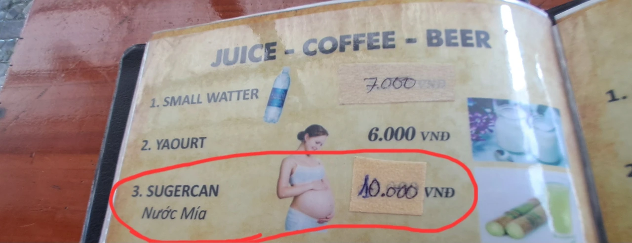 식당 점원이 사탕수수 주스를 추천했다. 즉석에서 사탕수수를 깎아 만들어줬다. 메뉴판에 임산부 표시가 있는 걸 보니 100% 자연식이라서 안심하고 마셔도 된다는 의미인 것 같다. 달콤했다.