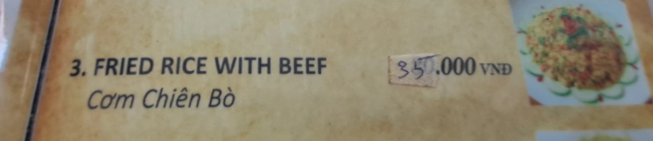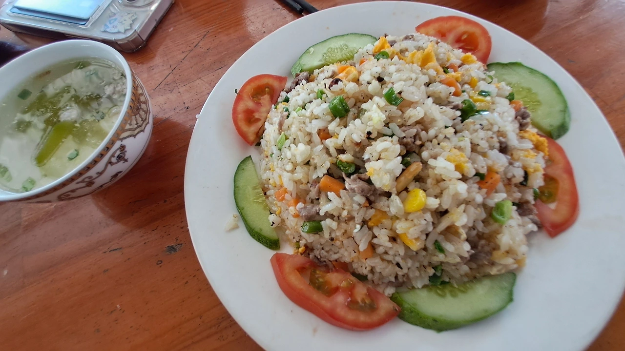 소고기볶음밥이다. 딸려 나오는 국이 채소국인데 닭으로 육수를 우린듯 하다. 어느 도시에서나 같은 국이었고 포장음식에도 항상 포함시키는 채소국이었다. 살짝 닭 누린내가 나는 집도 있었고, 무이네처럼 닭육수의 깊은 맛이 더 강한 집도 있었다.