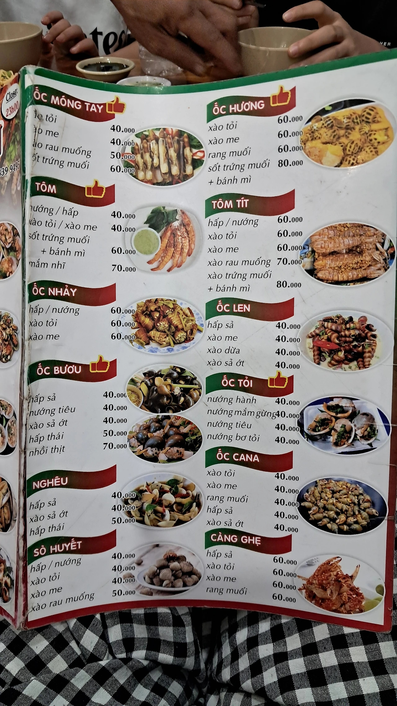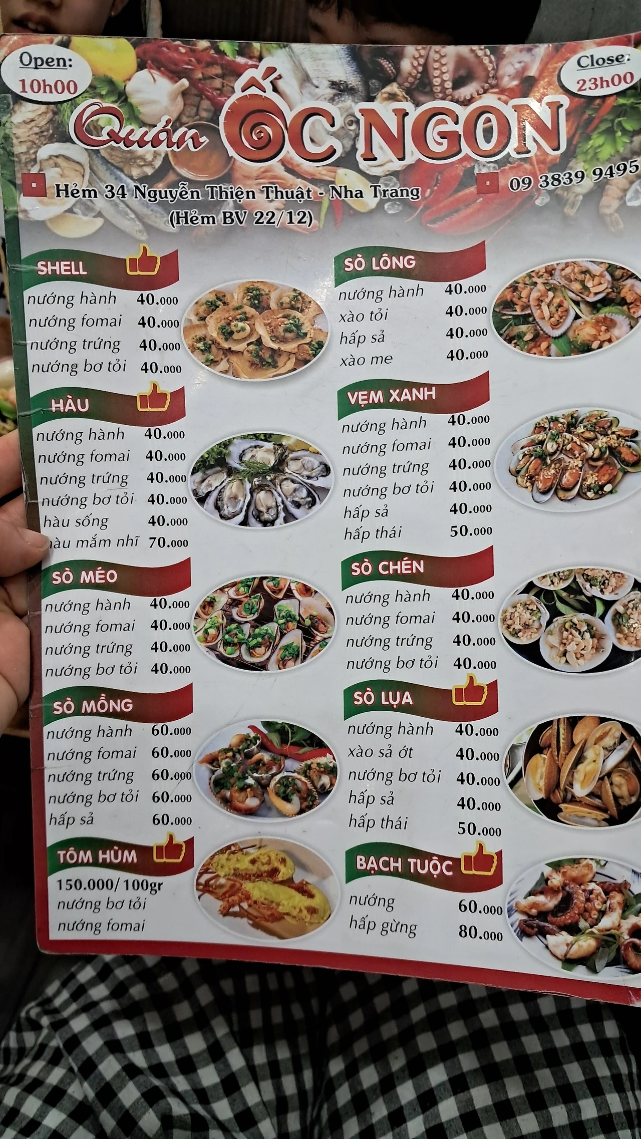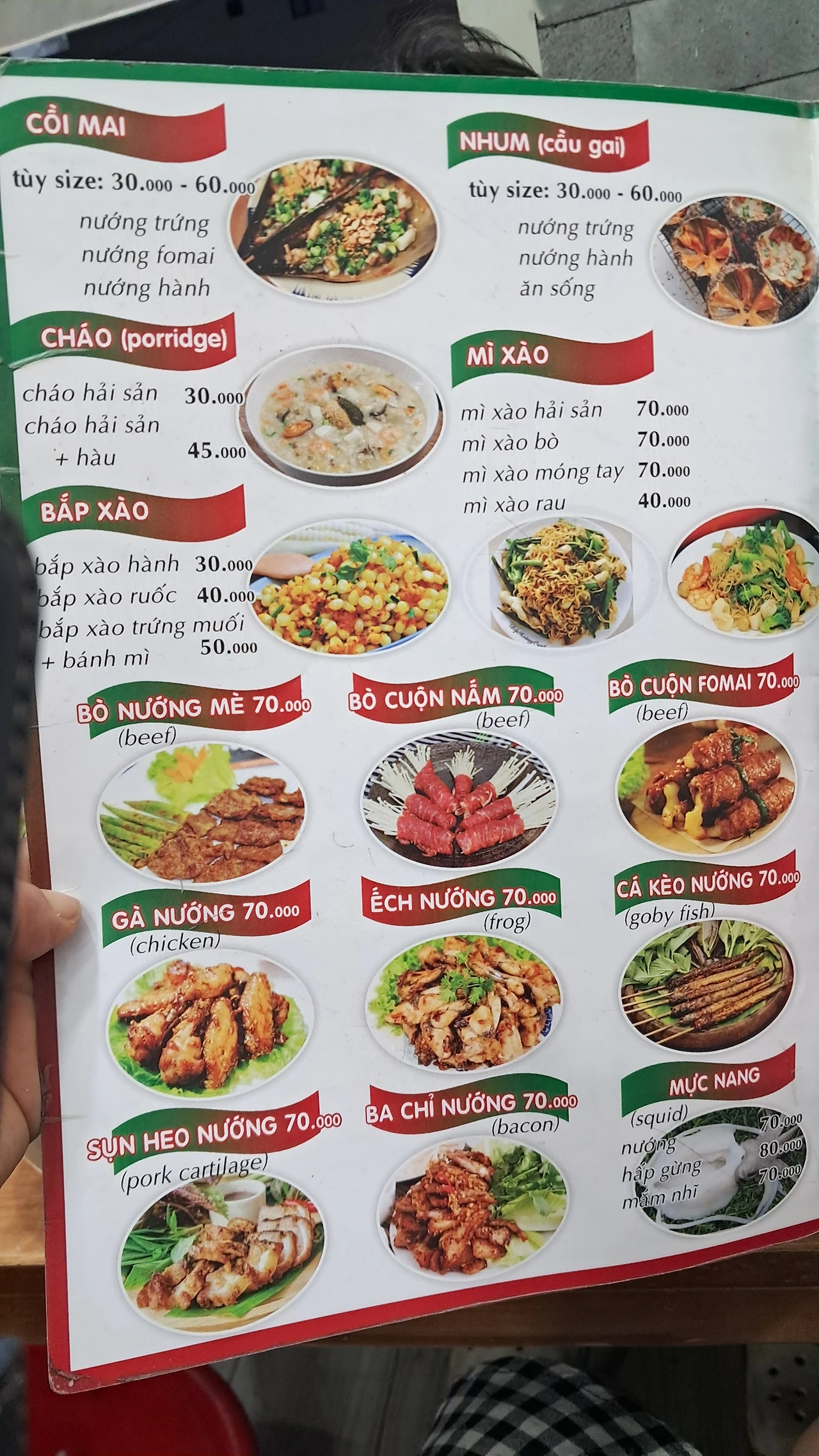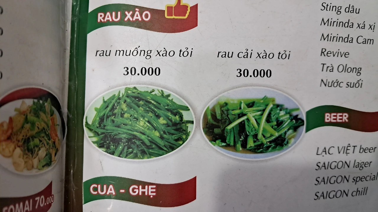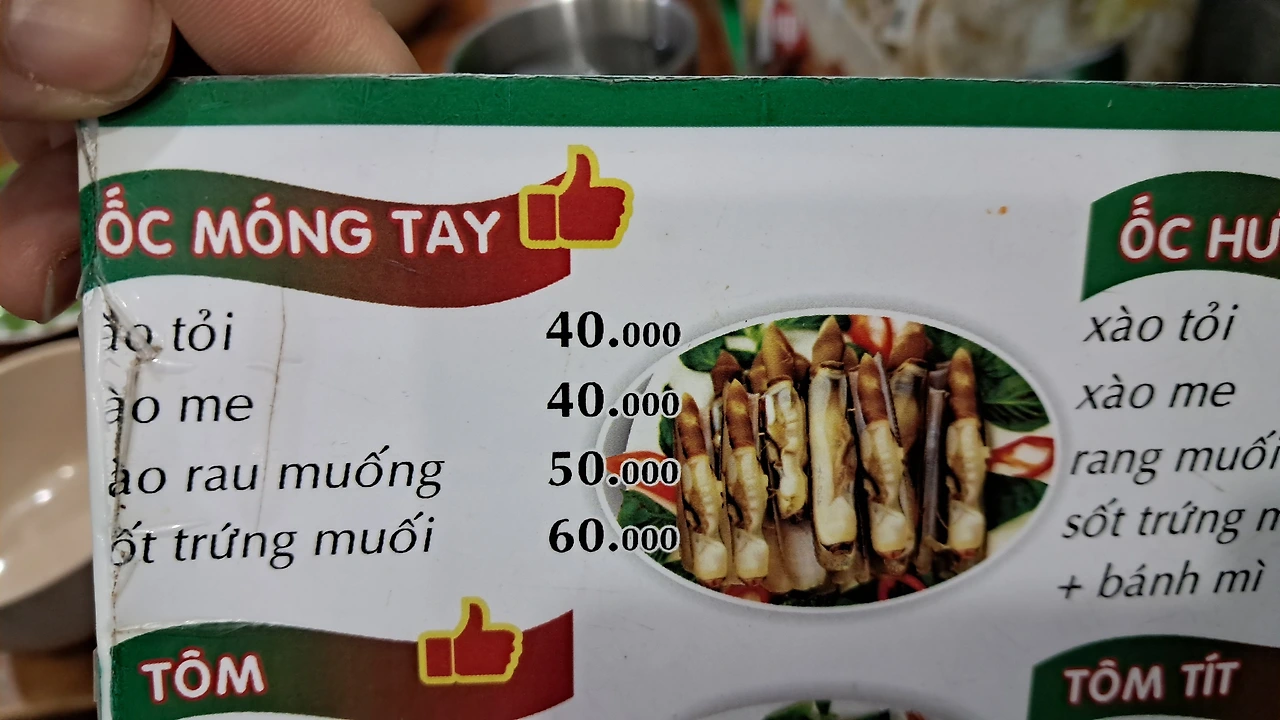 전체 메뉴판인데 가격이 저렴하다. 달랏 나혼자산다 팜유 원정대가 다녀가서 유명해진 식당의 메뉴와 비슷한데도 약 1/5 가격이다. 이곳 현지인 식당은 맛조개 볶음 한접시에 4만동이었고, 달랏의 나혼자산다 맛조개 볶음은 같은 한 접시에 20만 동이 넘었다.