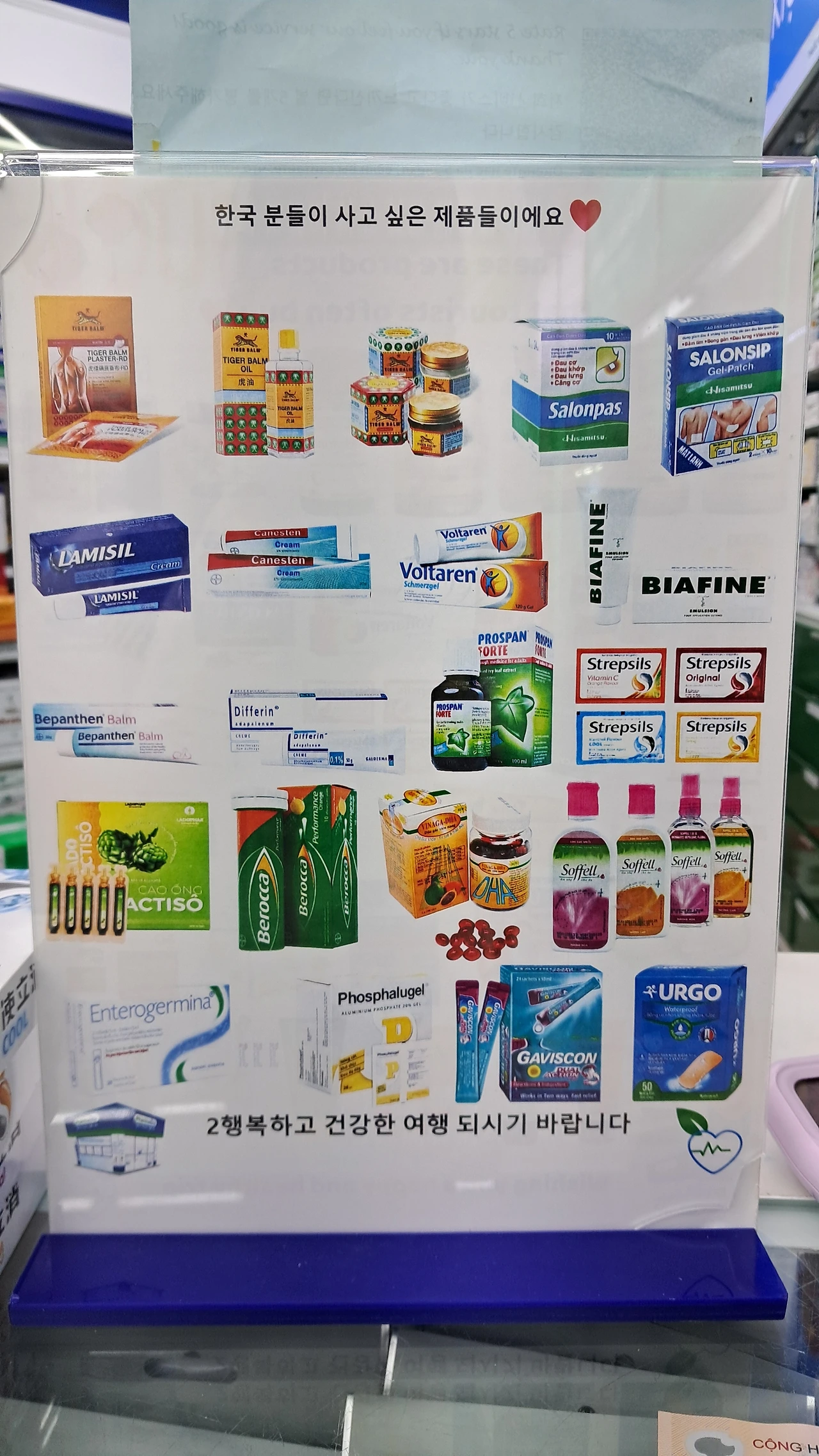 약사가 전혀 영어를 할 줄 몰라서 의사소통에 어려움이 있었다. 그런데 많은 한국인이 베트남에서 약쇼핑을 하나보다. 뒤늦게 한글 안내판을 발견했다. 우리는 비타민만 필요해서 비타민만 구입했다. 호랑이 연고, 스트렙실, 비판텐 밤, 라미실, 아티초크 앰플, 프로폴리스, 개비스콘 등등 한국인이 사랑하는 약이 많기도 하다. 국내와 가격차가 있어 베트남에서 저렴하게 구입하는 품목인가 보다.