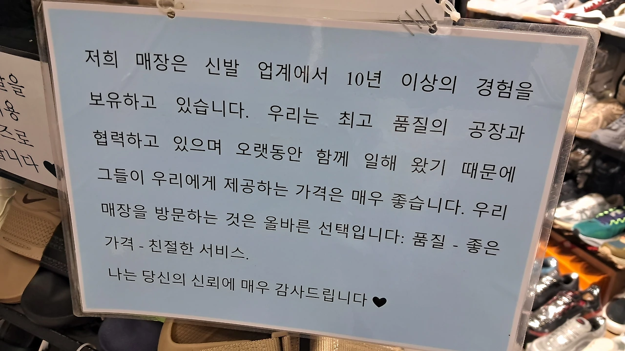 베트남 다낭 한시장과 나트랑 담시장에서의 신발과는 퀄리티가 다르게 튼튼했다. 아름다운 쓰레기는 사기 싫었지만 휘뚜루마뚜루 신고 다닐 거라고 해서 샀다. 초등 딸이 고른 회색 마크 운동화, 중학생 아들이 농구할 때(??) 신는다는 베이지 슬리퍼, 남편이 선택한 흰색 운동화이다.
