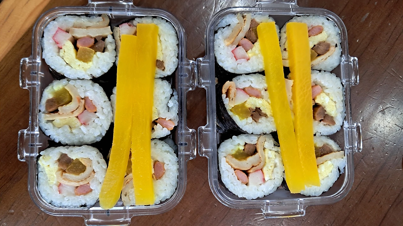 오늘 아침에 남편이 밥솥에 있는 모든 밥을 사용해 김밥을 쌌다.