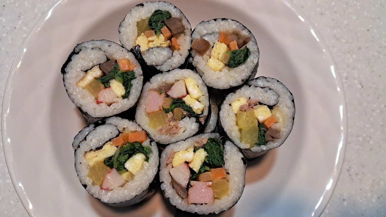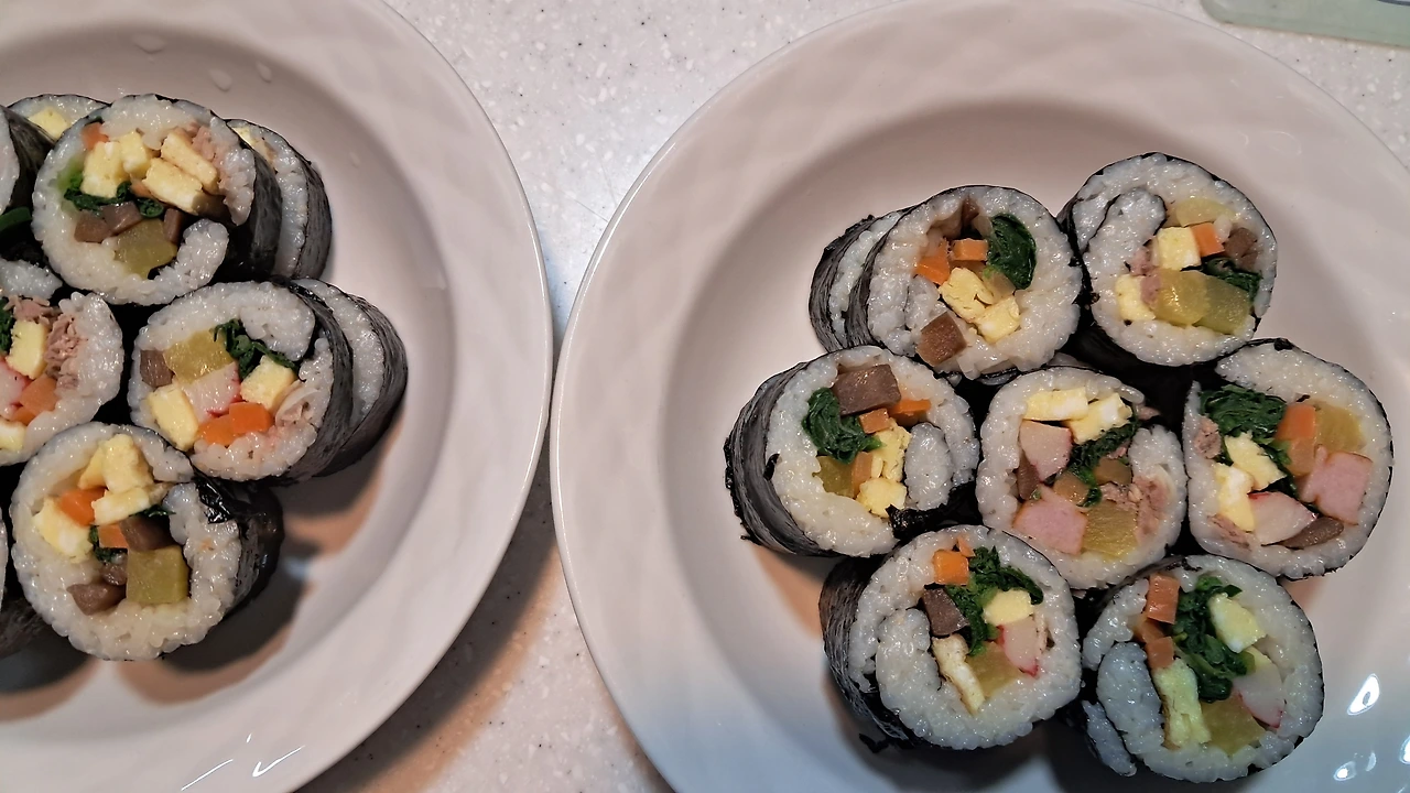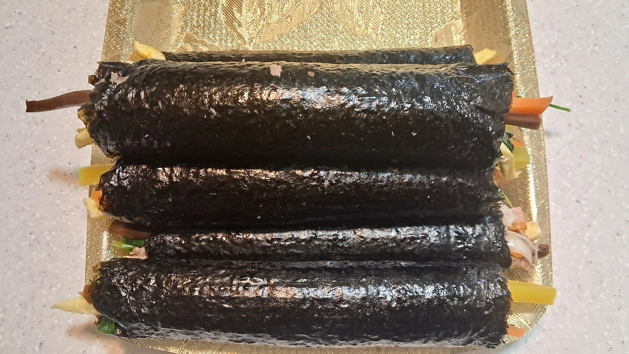 밥통에 있는 밥에 참기름, 식용유, 소금으로 간을 맞춰 비볐다. 장갑 낀 손으로 한 덩이씩 둥글게 잡아 김 위에 얇게 펴 바른다. 속재료를 쌓고 김의 한쪽 끝면을 접어 심지를 만든다. 심호흡을 하고 심지를 잡아 속재료를 덮듯 야무지게 말아본다. 그리고는 팽팽하게 당긴다. 살살 굴려 김 끝에 밥알을 붙인다. 적성에 안 맞지만 흉내 내봤다.