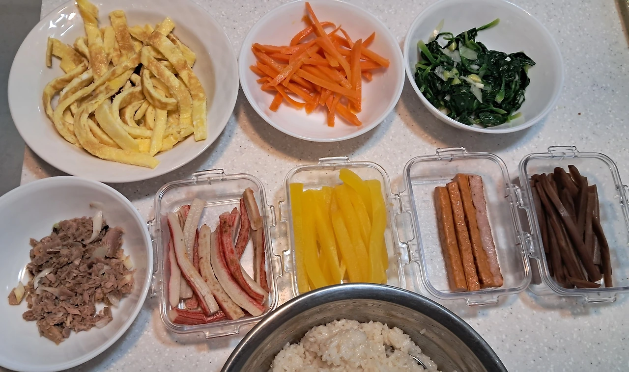 하루종일 누워 골골거리다 저녁에서야 살아났다. 남편이 금요일에 사용하고 남은 김밥 재료를 활용하는 건 어떠냐고 한다. 좋은 생각이다.