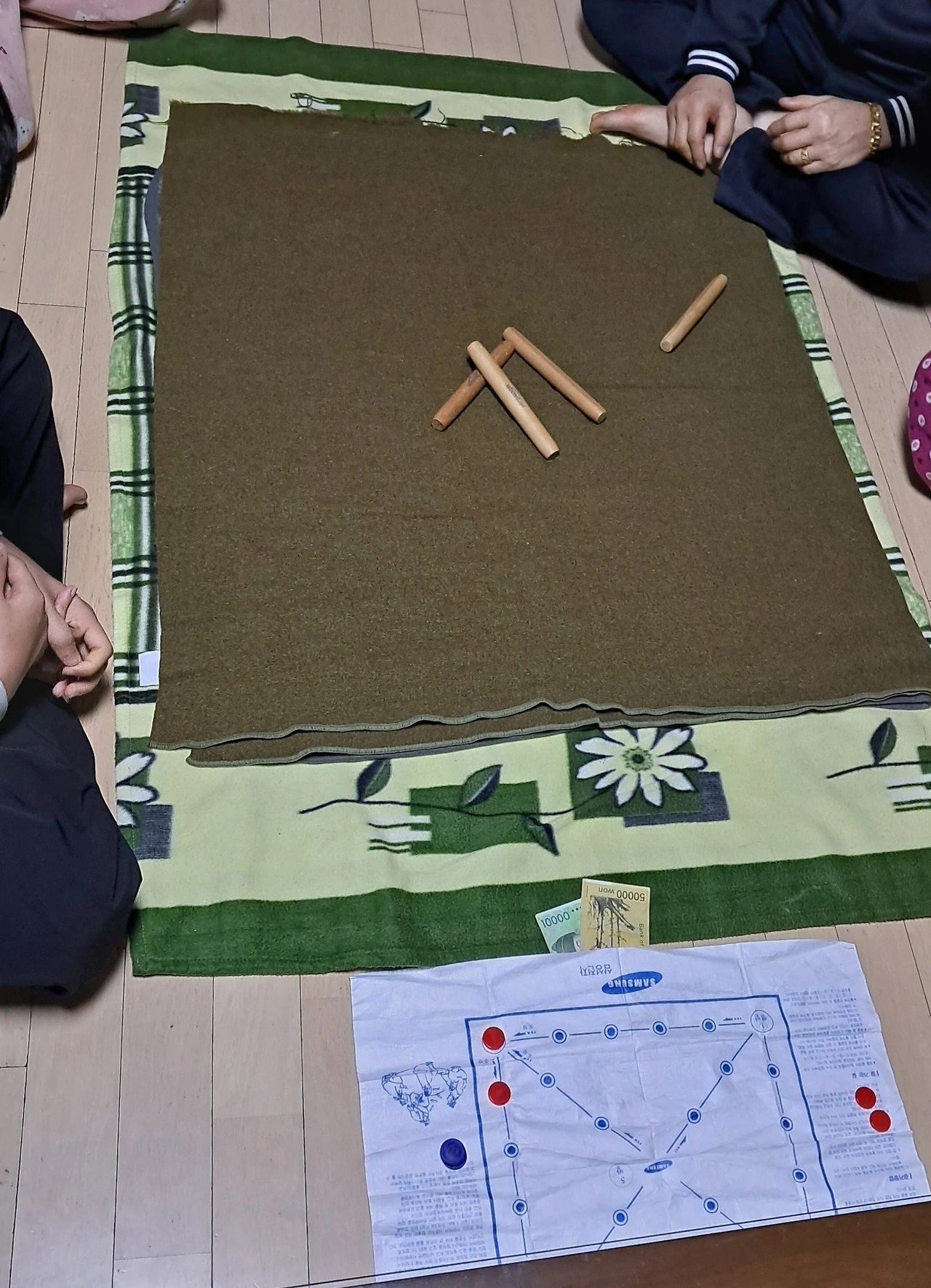 설 같지 않은 정적을 깨려는지 윷놀이를 하자고 하신다. 남편과 중학생 아들, 초등학생 딸이 A팀, 시누, 시아주버님, 시어머님이 B팀이다. 3만 원 내기를 했나 보다. 몸이 아파 승부욕에 찬 우리 집 아이들의 표정을 살피며 관람한다. 새삼 노총각이던 남편이 결혼해서 한 팀을 이룰 만큼 애들을 키운 게 대견하다고 느껴진다. 오늘 보니 우리 집 중학생 아들의 옆모습이 영락없이 남편을 닮아 피식 웃었다. 절대 안 지려고 전략을 이리저리 짜는 모습은 나를 닮았다.