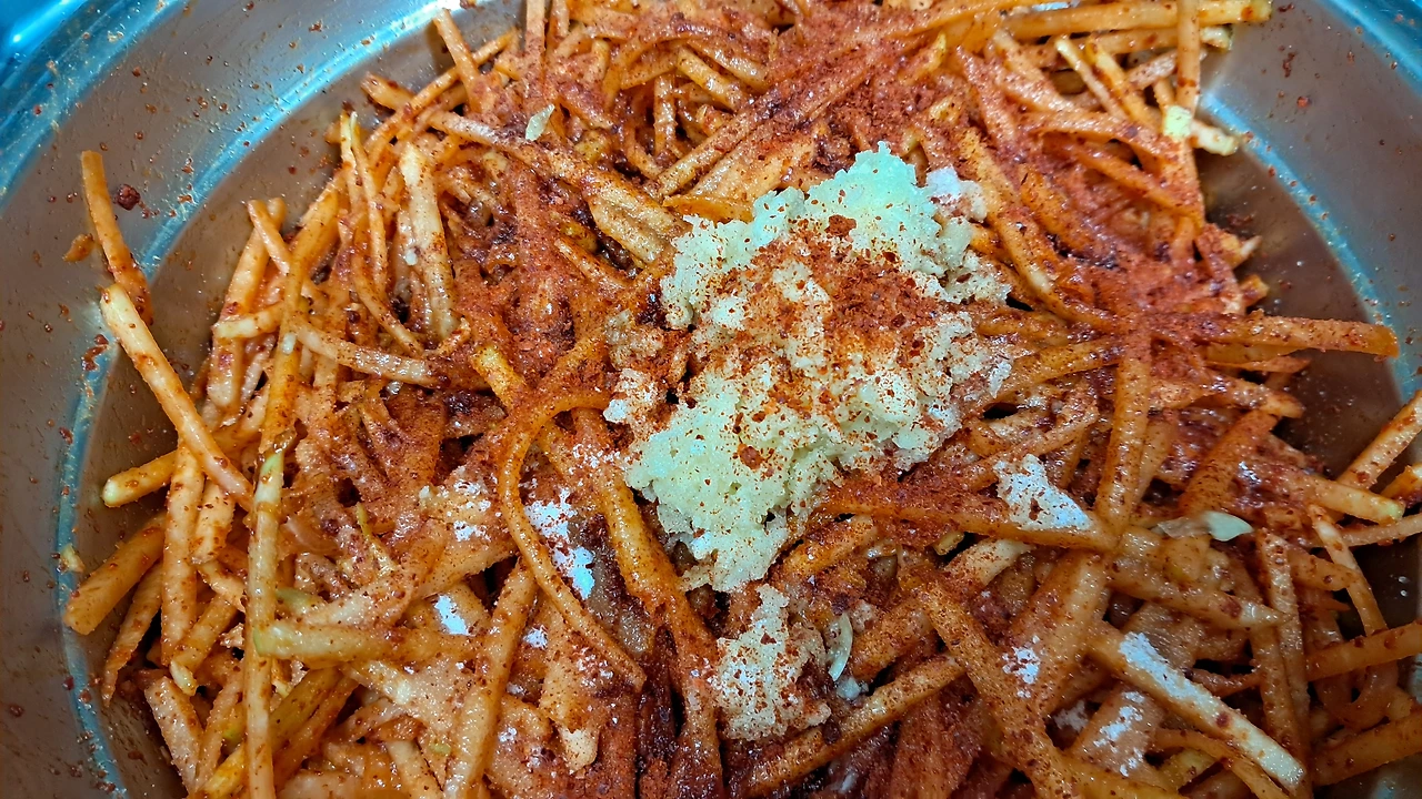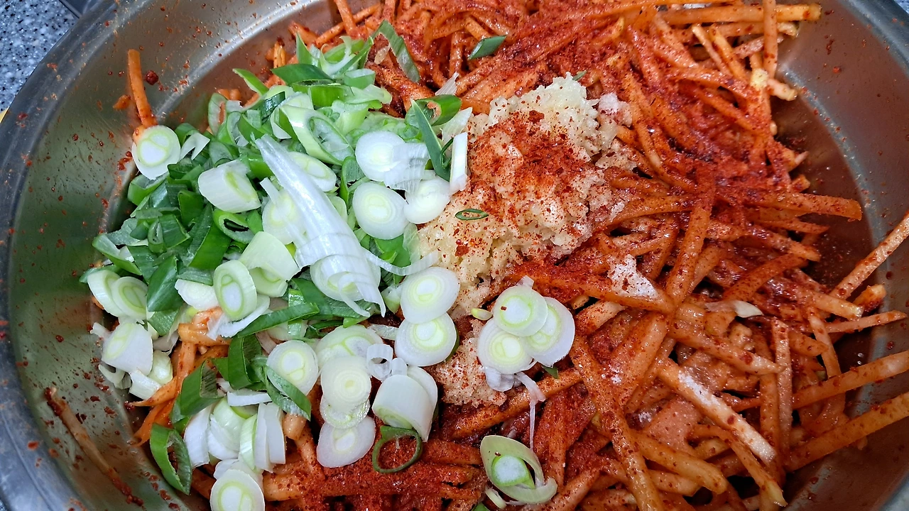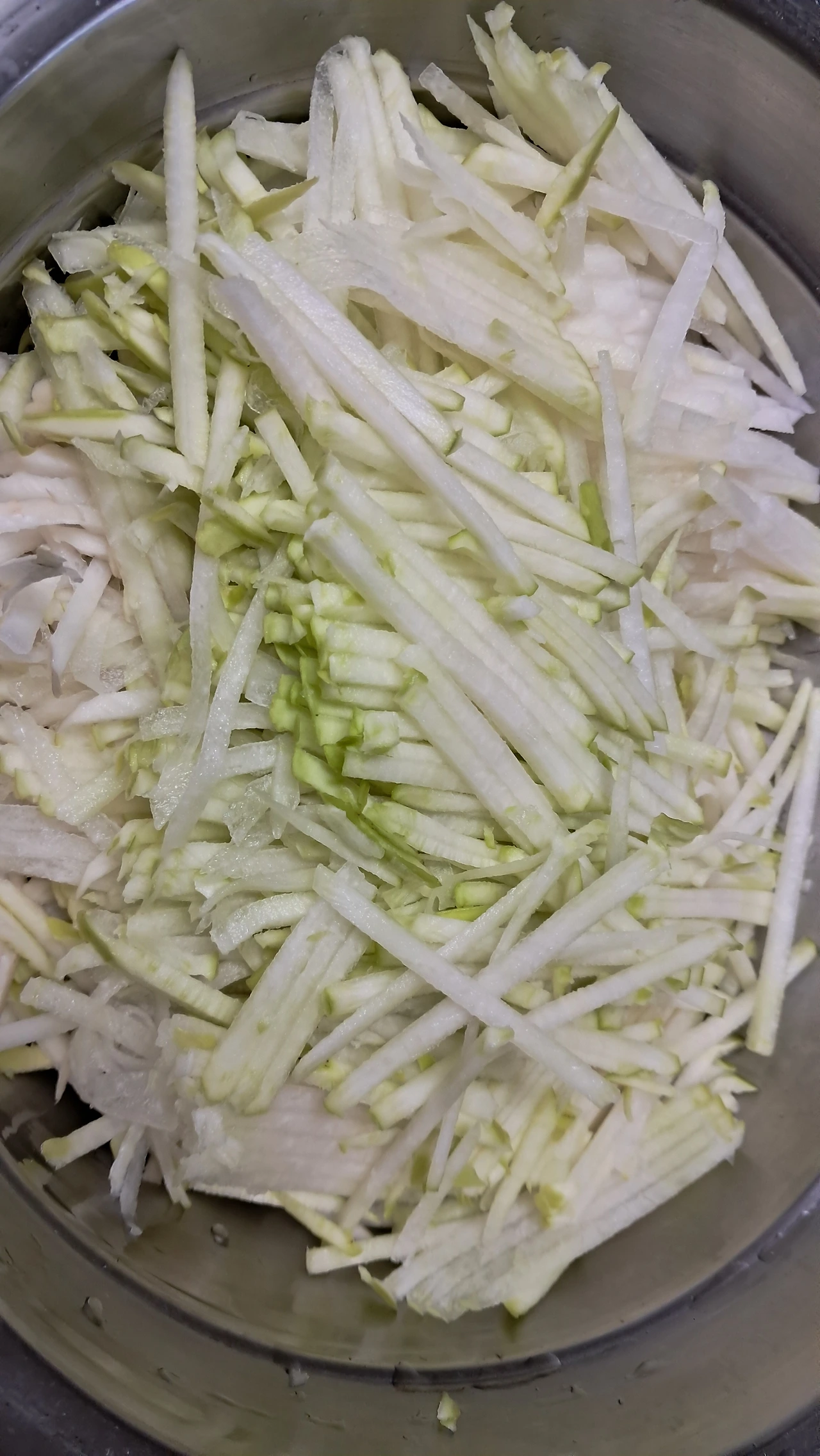 오늘 드디어 무생채를 배웠다. 총각무(달랑무), 깍두기, 배추김치, 무청 얼갈이김치, 파김치, 백김치, 동치미는 언제 배우나 싶다. 어머님은 무생채 만드는 방법과 다른 김치 만드는 방법이 기본적으로 같다고 말씀하신다. 총각무는 소금에 절여 만드신다고 한다. 열무김치는 열무를 절이고 찹쌀풀이 아닌 밀가루풀을 만들어 조금 넣어야 깔끔하다고 말씀하셨다. 김치의 세계는 어렵고도 간단하다.