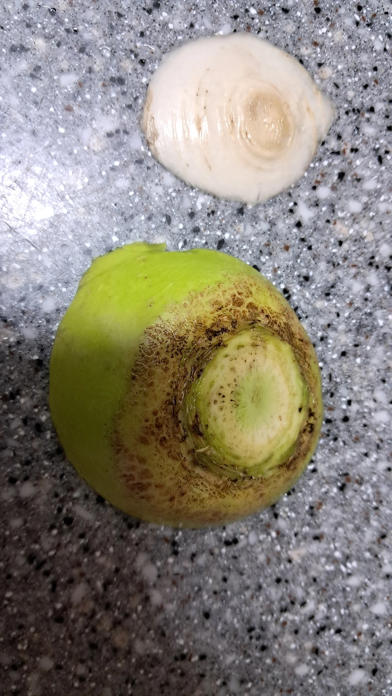 1. 무 겉면을 씻는다. 무의 양끝을 바짝 자른다. 연두색 부분을 너무 많이 잘랐다고 한소리 하셨다. 흰 부분처럼 아주 조금만 자르면 된다고 하신다. 껍질은 안 벗기신단다. 다음부턴 양 끝부분을 배 깎듯 깎아야 낭비가 없겠다.