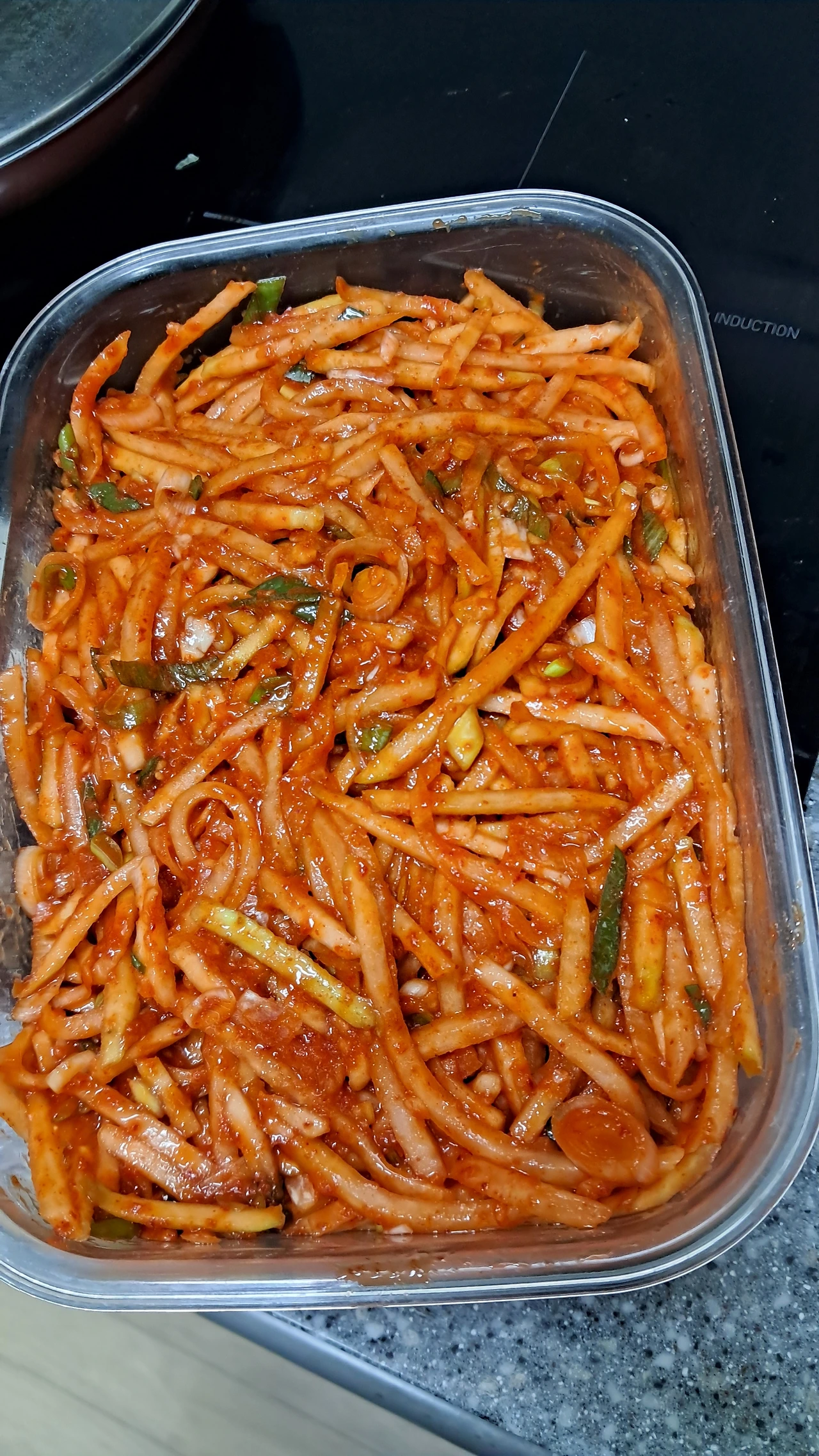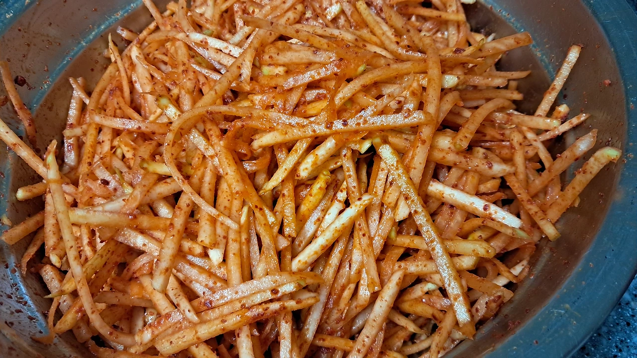 친정어머니도 정말 음식을 잘하셨다. 된장, 고추장, 간장이 동네에서 가장 맛있는 집이라고들 하셨다. 엄마가 만드시던 채지(무생채)에는 고춧가루를 많이 넣지 않으셨다. 말 그대로 무에 빨간 물만 약하게 들이셨다. 분홍에 가까웠다. 설탕이 조금 많이 들어갔던 기억이 난다. 설탕 대신 매실액을 넣기도 하셨다. 참기름에 채지만 넣고 밥 비벼 먹어도 맛있었다. 친정엄마는 항상 밭에서 바로 무를 뽑아 만드셨다. 밭이 냉장고였고, 거의 모든 채소를 자급자족하셨다.