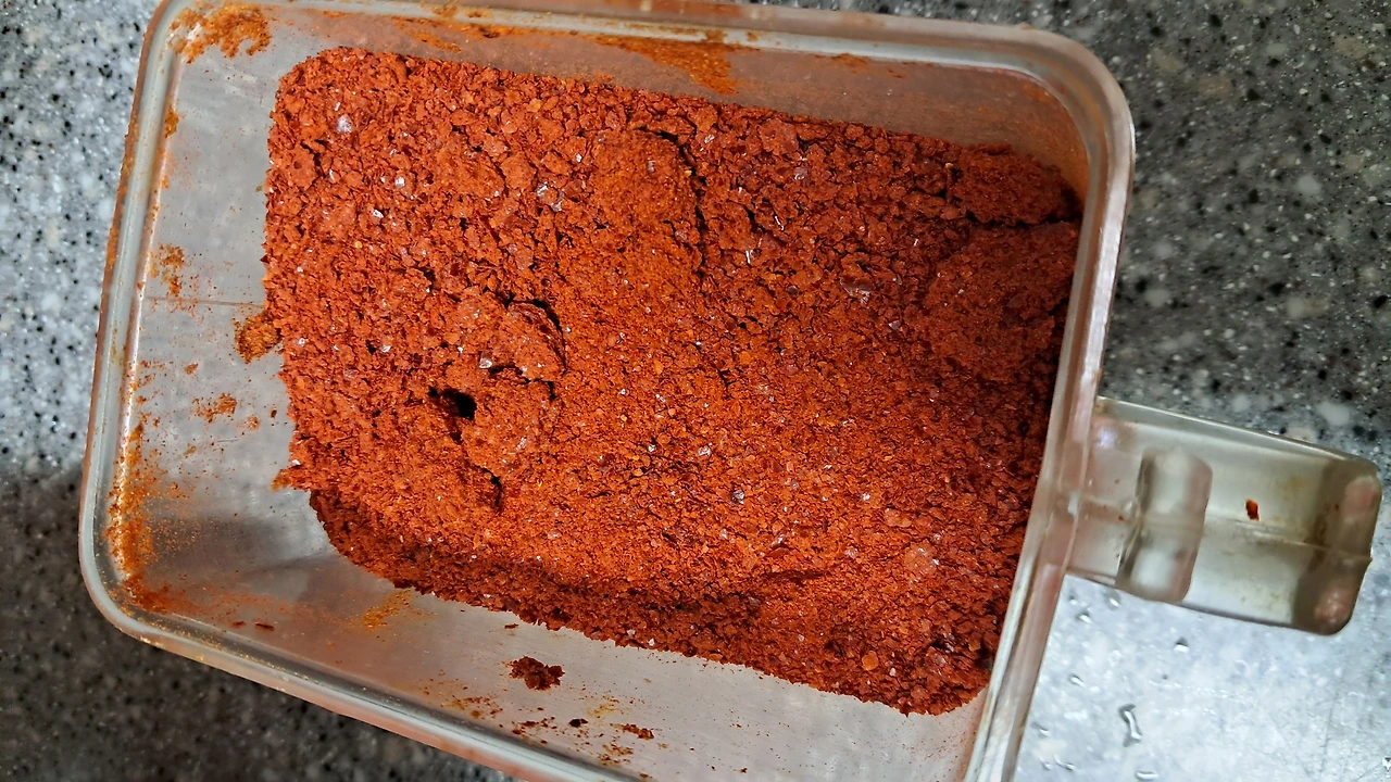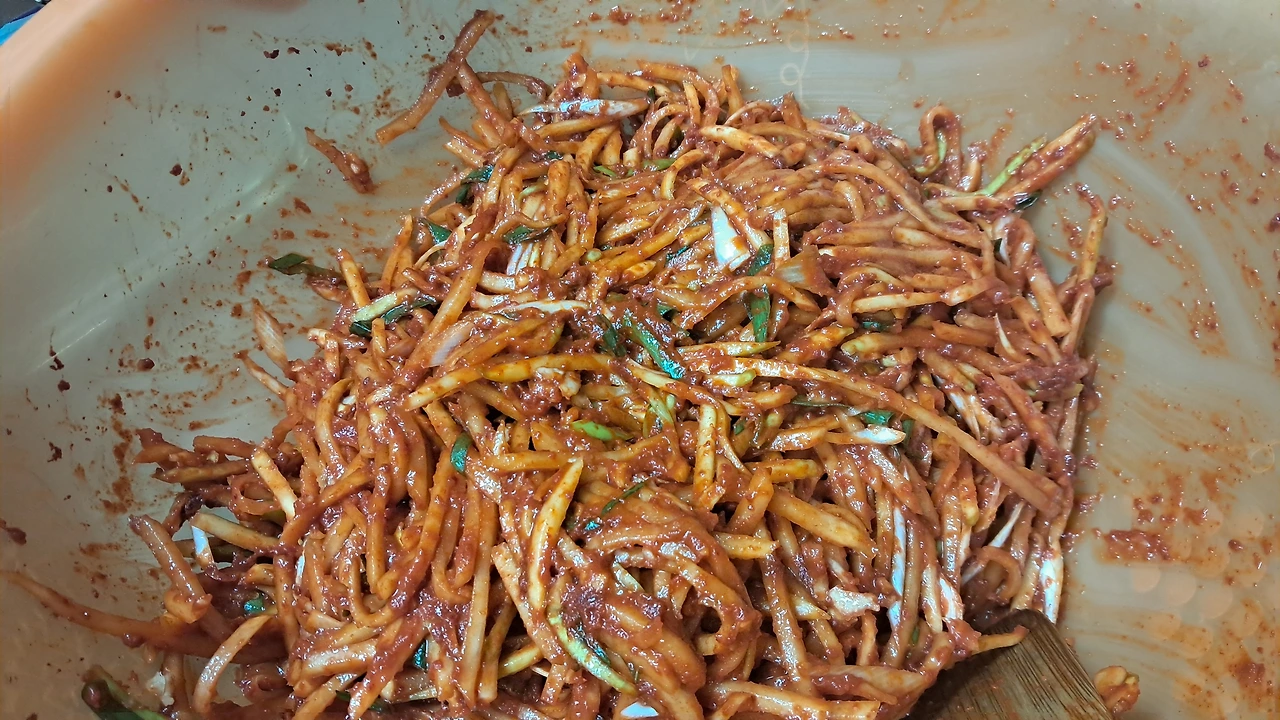 5. 고춧가루 한 스푼을 추가해서 마지막으로 버무린다. 맛을 보면서 설탕, 소금, 액젓을 추가해서 간을 맞춘다고 하신다. 맛을 보시더니 싱겁다시며 엄청난 양의 맛소금과 액젓 세 스푼을 더 넣으신다. 생각보다 염분이 많이 들어간다.
