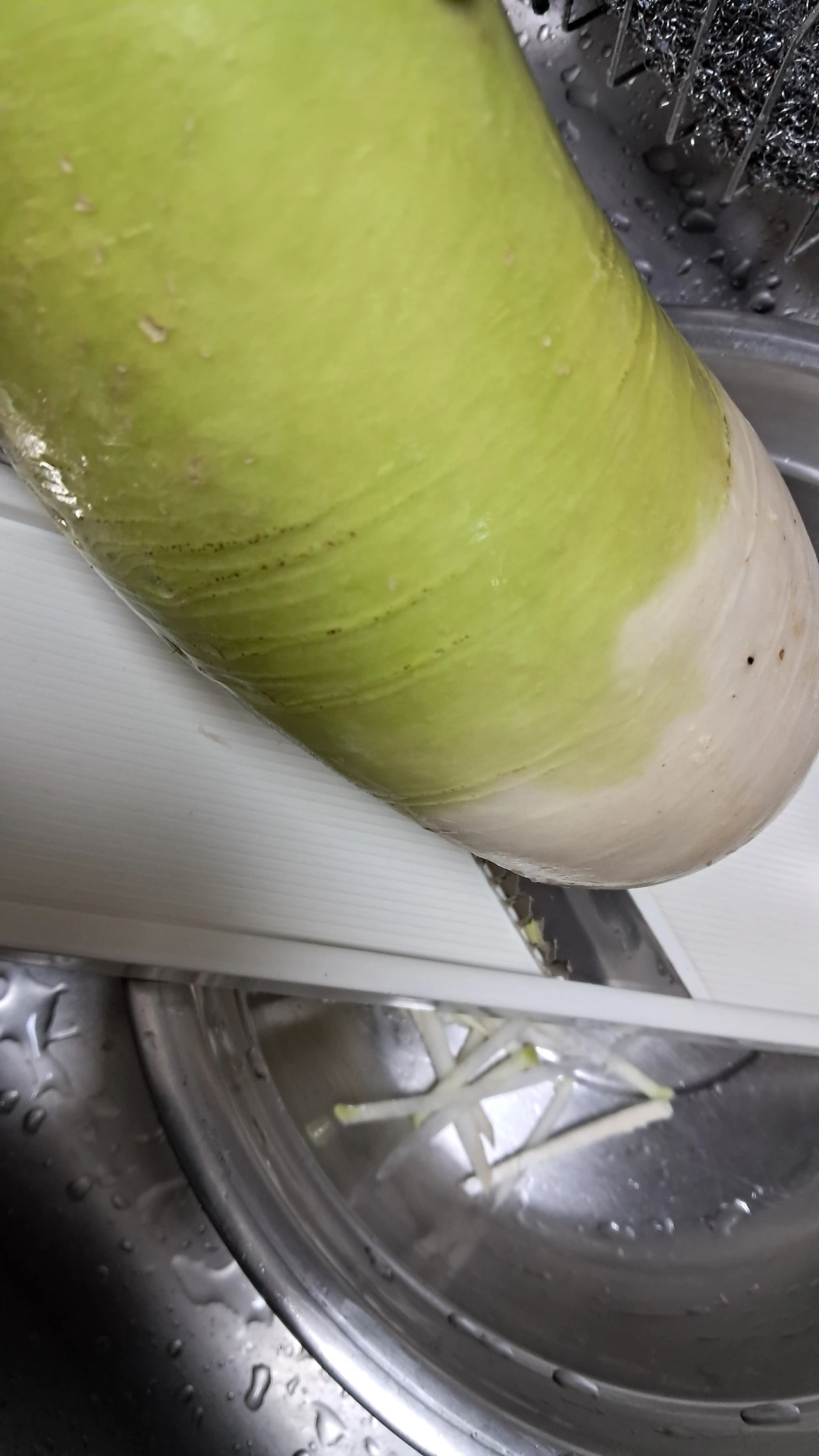 2. 무를 통째로 잡고 측면부터 강판에 갈라고 하신다. 손 다치니 무를 절반 자르지 않고 그냥 하라고 하셔서 바닥에 놓고 앉아서 했다. 무 끝 조금 남은 건 손 다칠까 봐 칼로 채를 썰려다 그냥 먹었다.